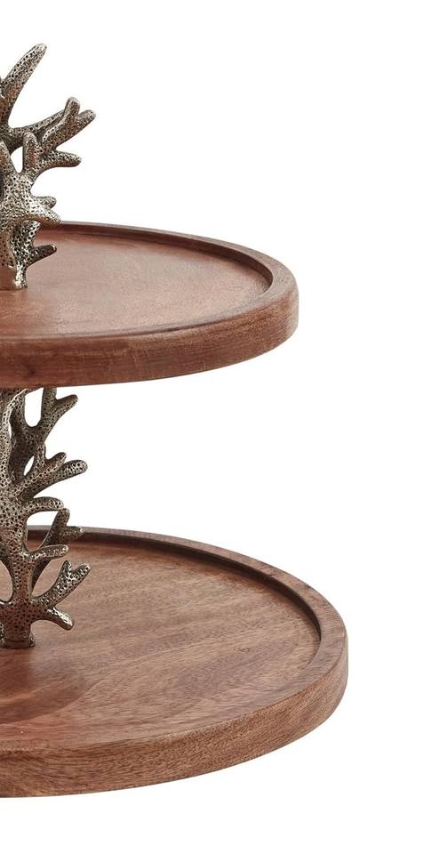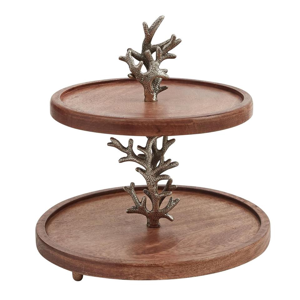 ชั้นวางเค้กไม้ 2 ชั้น ขาโลหะสีคอรัล ถาดเสิร์ฟแบบมีชั้น สำหรับตกแต่งเค้กสไตล์ชายทะเล เหมาะสำหรับงานปาร์ตี้ธีมชายหาด ตกแต่งบ้าน