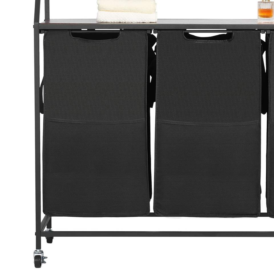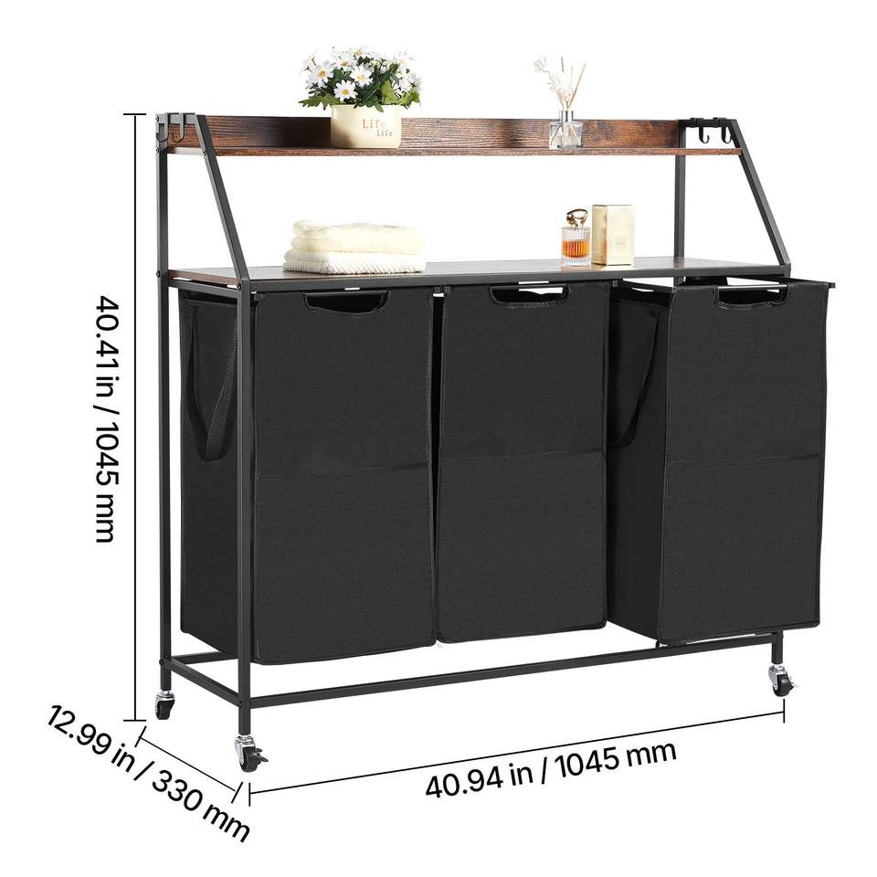 2 Tiers Tall Laundry Hamper with Metal Frame and Wooden Tabletop 3 Section Rolling Basket Organizer Storage Laundry Baskets