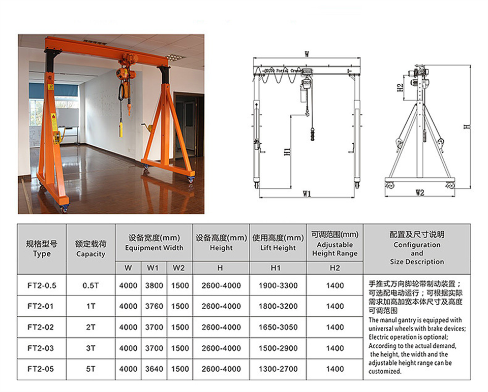 เครนแบบเคลื่อนย้ายได้สำหรับโกดังขนาด2ตันพร้อมรอกสำหรับเวิร์คช้อป