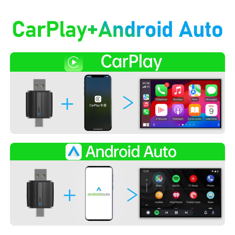 อะแดปเตอร์ไร้สาย Apple CarPlay และ Android Auto 2 in 1 พร้อมบลูทูธ 5.4 ควบคุมด้วยเสียง ได้รับการรับรองมาตรฐาน CE/FCC/ROHS ใช้งานได้กับรถยนต์ทั่วไป
