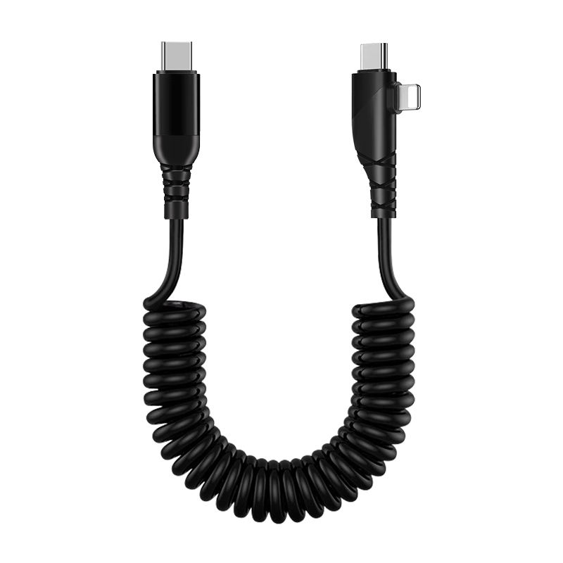 สายชาร์จในรถยนต์แบบ 2-in-1 สำหรับระบบนำทาง CarPlay, PD 60W ชาร์จเร็ว แบบสปริงยืดหดได้ หัวต่อแบบ Dual Type-C ตัวผู้