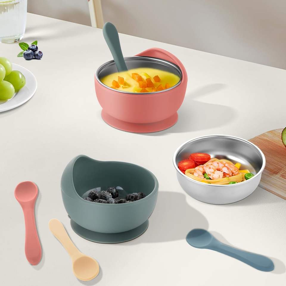 ชุดชามดูดซิลิโคนสเตนเลสแบบ2-in-1ภาชนะใส่ขนมขบเคี้ยวปลอดสารพิษเครื่องดูดแบบถอดได้สำหรับเด็กวัยหัดเดินสี Morandi