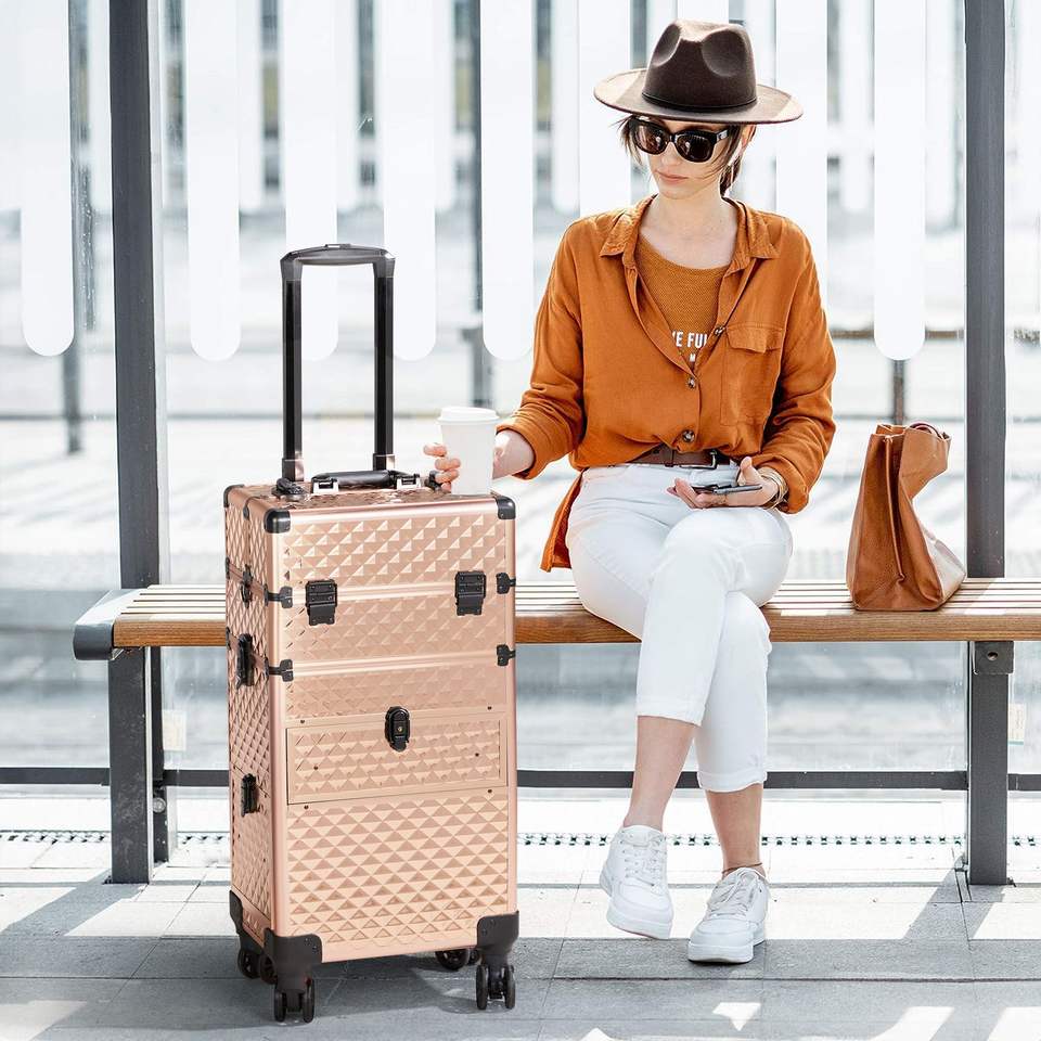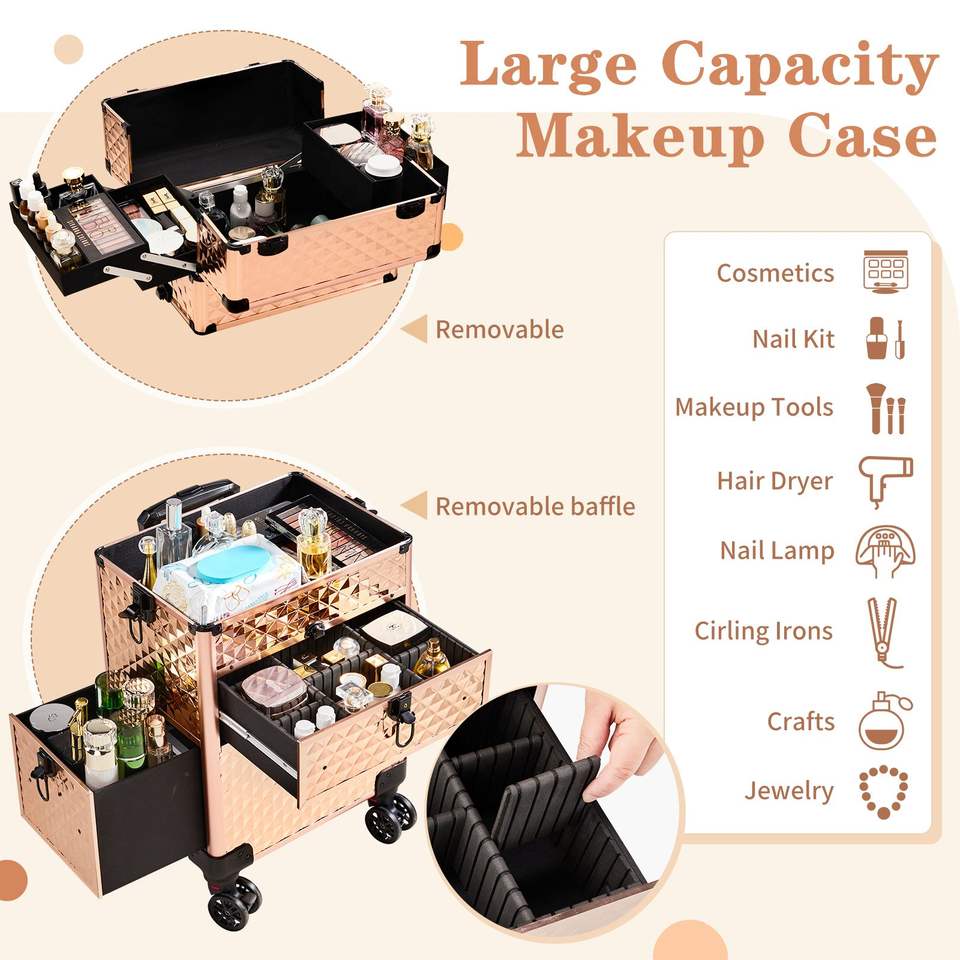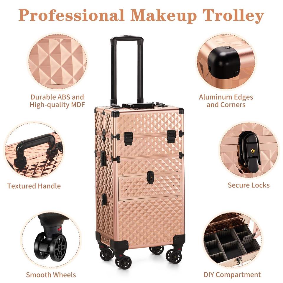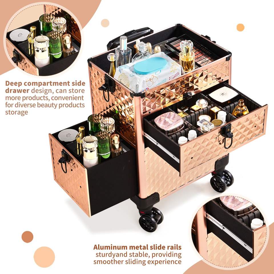กระเป๋าเครื่องสำอางแบบ 2-in-1 พร้อมลิ้นชักด้านหน้าแบบเลื่อน ลิ้นชักด้านซ้ายแบบแบน ลายเพชร สีแชมเปญ อะลูมิเนียม ล้อเลื่อนถอดได้