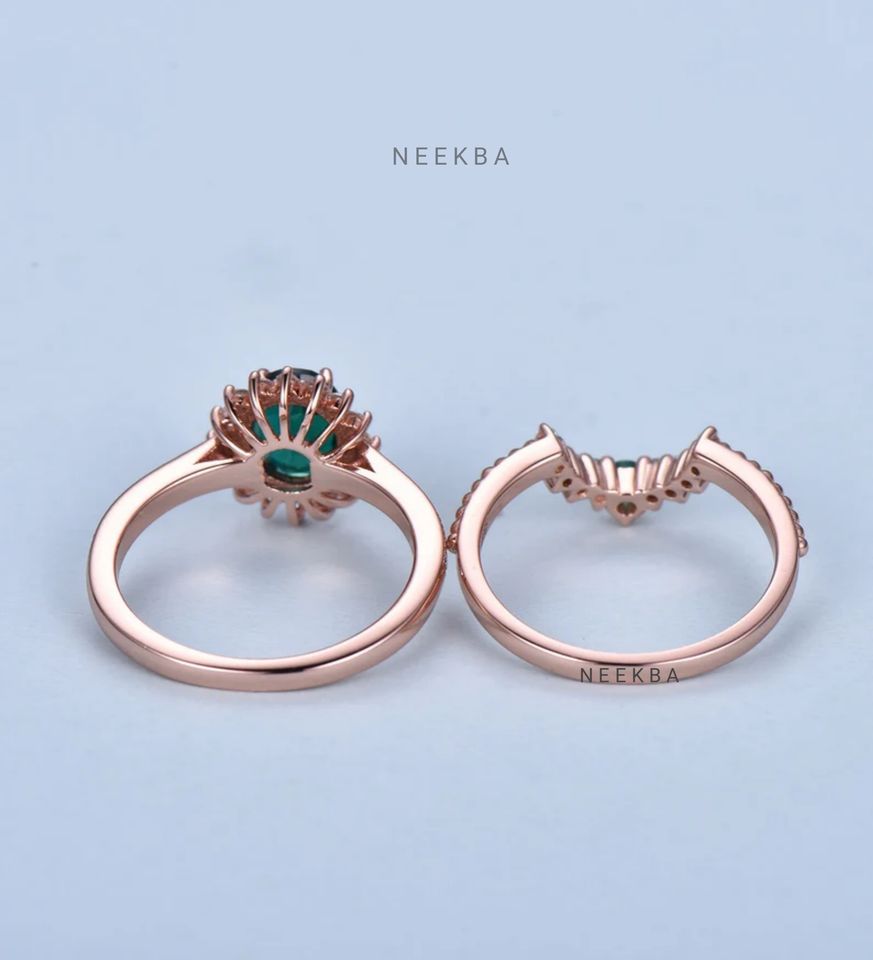 ชุดแหวนเจ้าสาว2ชิ้นพร้อมชุดแหวนแต่งงานสีเงิน925มรกตเจียระไนรูปวงรีตัดในห้องปฏิบัติการพร้อมตัวเลือกการเปลี่ยนพลอย