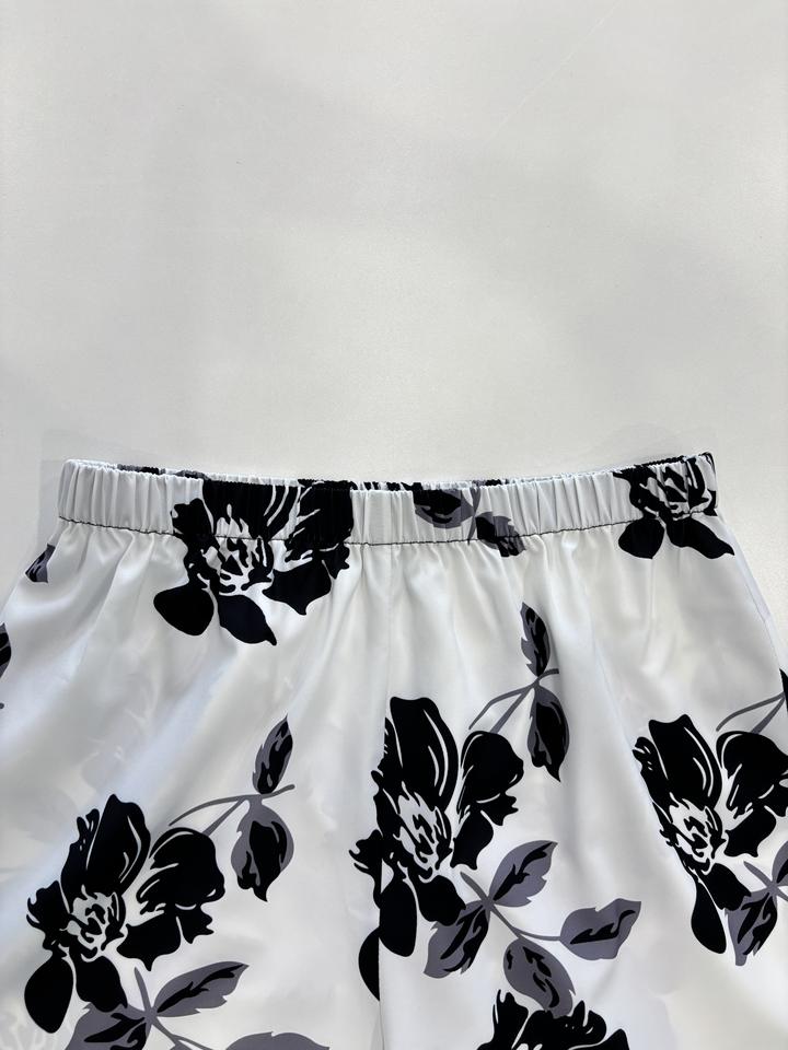 ชุดเซ็ต 2 ชิ้น ลายดอกไม้สีดำขาว สไตล์มินิมอล เรียบง่าย ระบายอากาศได้ดี ODM เสื้อแขนยาวทรงไม่สมมาตร กางเกงขายาวทรงกว้าง สำหรับรอมฎอน ฤดูใบไม้ผลิ/ฤดูร้อน