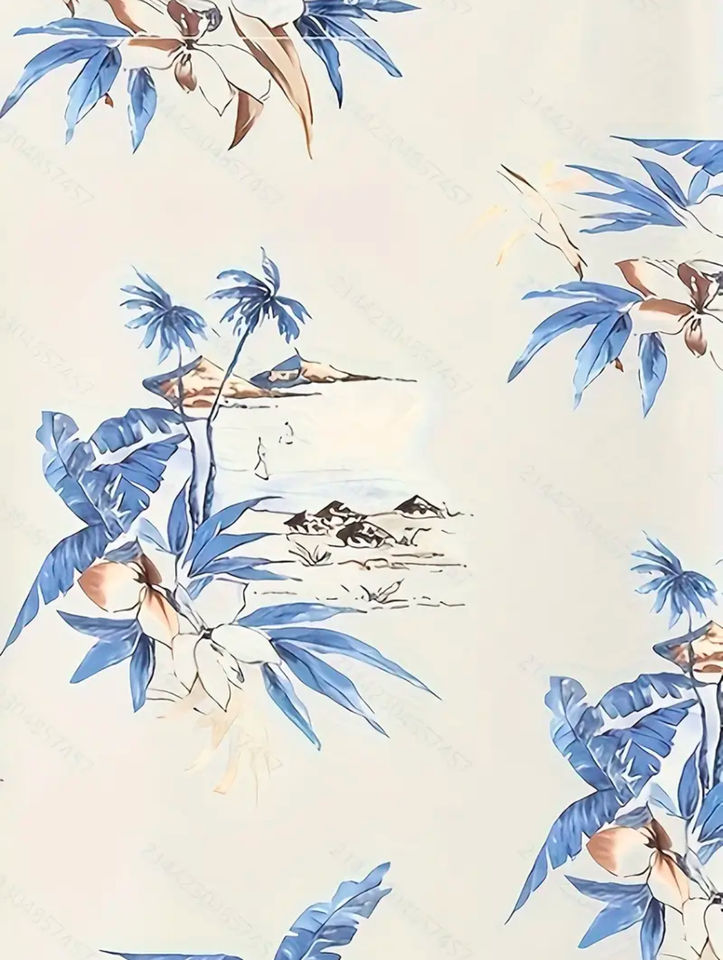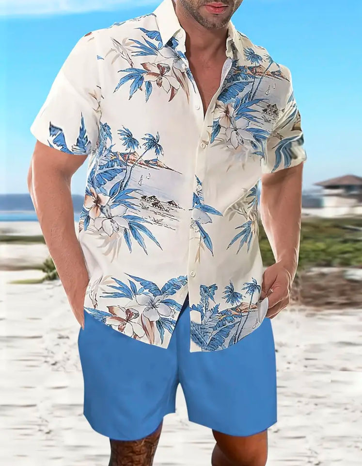 ชุดเสื้อผ้า2ชิ้นสำหรับผู้ชาย, ชุดฤดูร้อนสไตล์ฤดูร้อนเสื้อแขนสั้นมีกระดุมพิมพ์ลายต้นมะพร้าวและกางเกงขาสั้นเชือกผูกสำหรับชายหาดรีสอร์ท