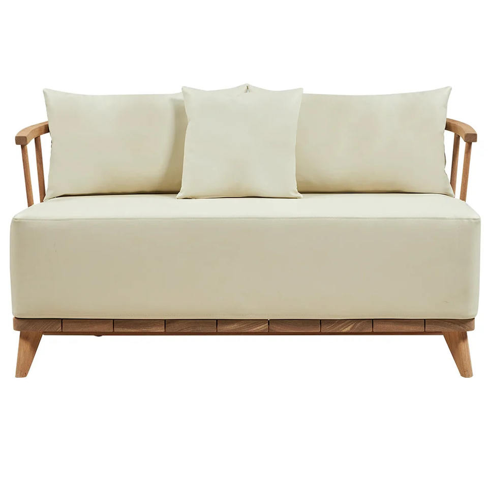 โซฟาไม้สัก 2 ที่นั่ง พร้อมเบาะนั่งและพนักพิงนุ่มสบาย ตกแต่งด้วยสีไม้ธรรมชาติ สำหรับใช้ภายในอาคาร