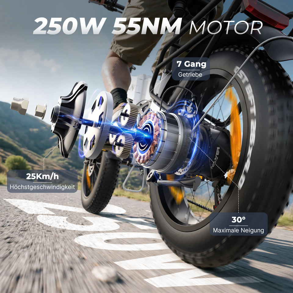 จักรยานไฟฟ้าพับได้ยางอ้วน 20 นิ้ว กำลังสูงสุด 750 วัตต์ 48 โวลต์ 13 แอมป์ชั่วโมง ระยะทางวิ่ง 120 กิโลเมตร ระบบกันสะเทือนคู่ รับน้ำหนักได้ 150 กิโลกรัม มาตรฐาน IP65 มีสินค้าในคลังสินค้า EU