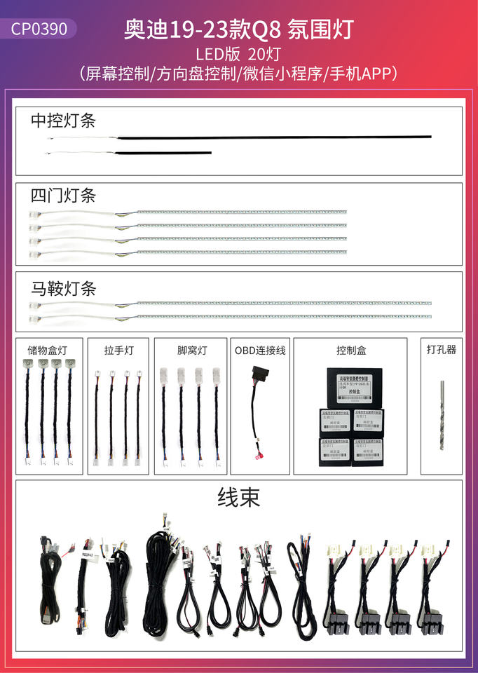 ชุดไฟตกแต่งภายในรถยนต์ 20 LED สำหรับ Audi Q8 ปี 2019-2023 ไฟ RGB ควบคุมผ่านแอพ/พวงมาลัย แบบเสียบใช้งานได้ทันที
