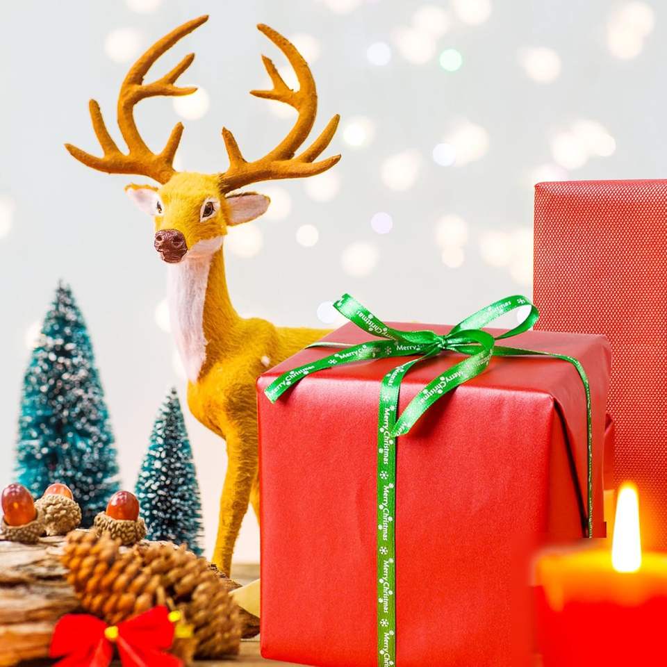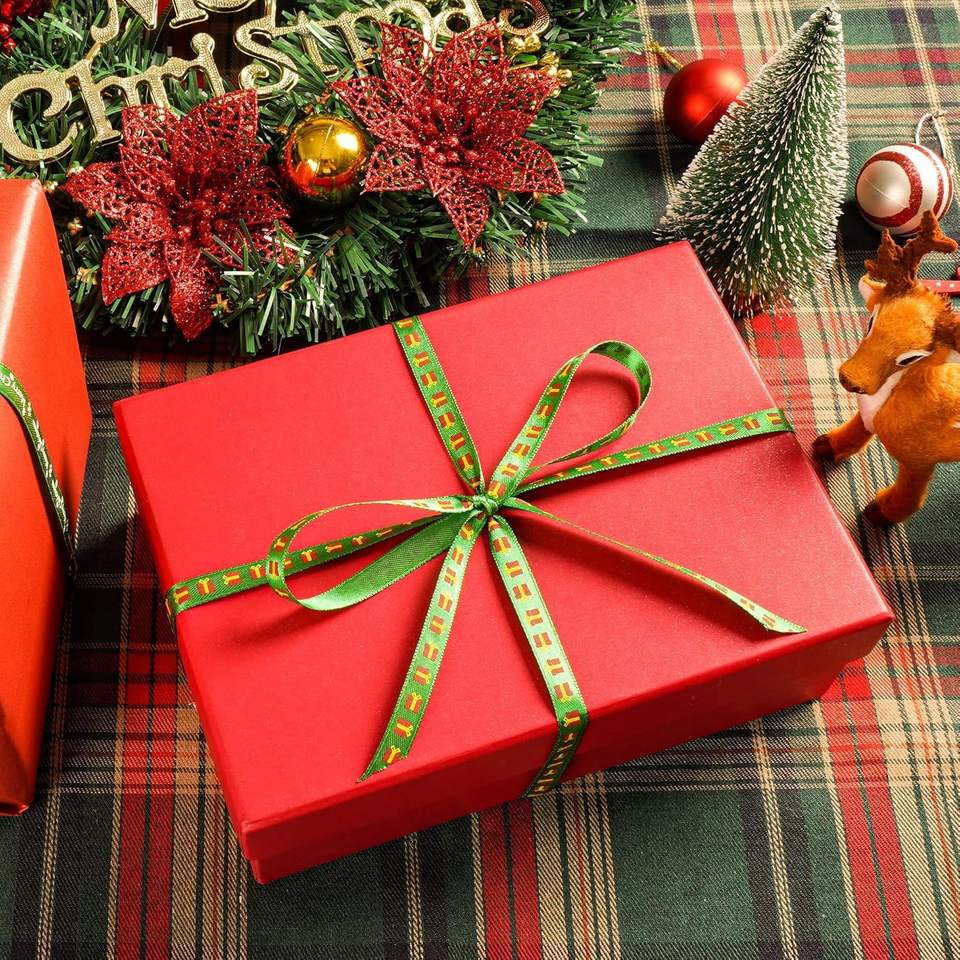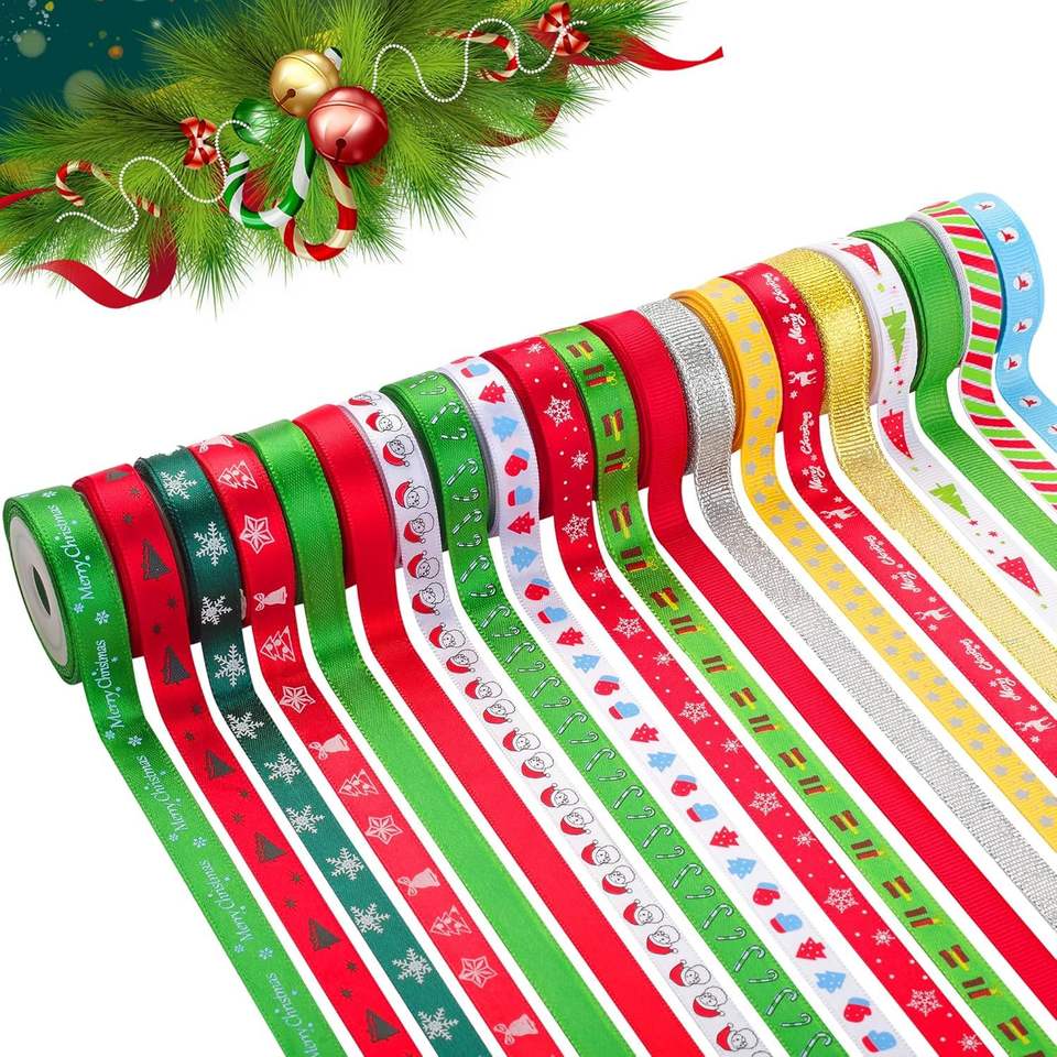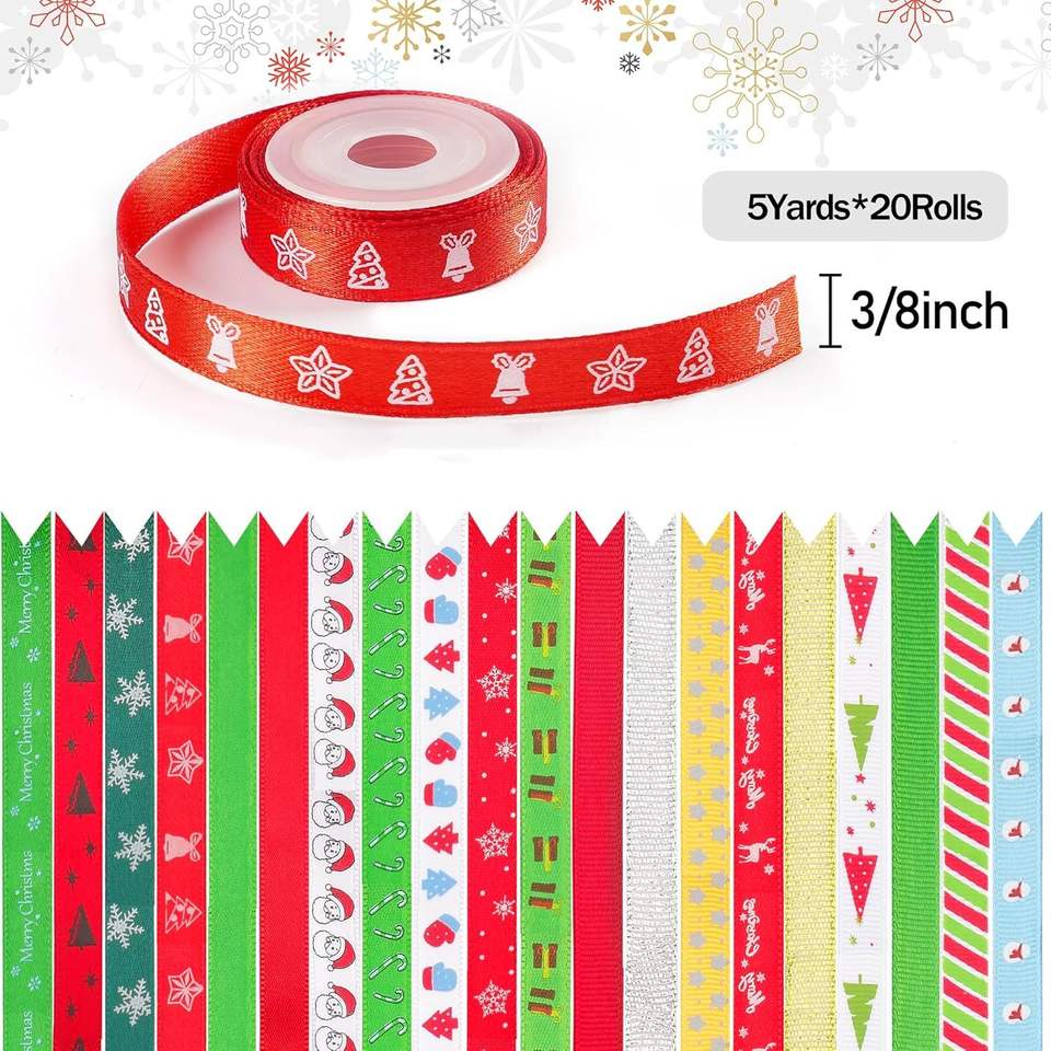 ริบบิ้นโกรเกรนพิมพ์ลายคริสต์มาสขนาด 3/8 นิ้ว 20 ม้วน ยาว 100 หลา สำหรับห่อของขวัญและตกแต่งในเทศกาล