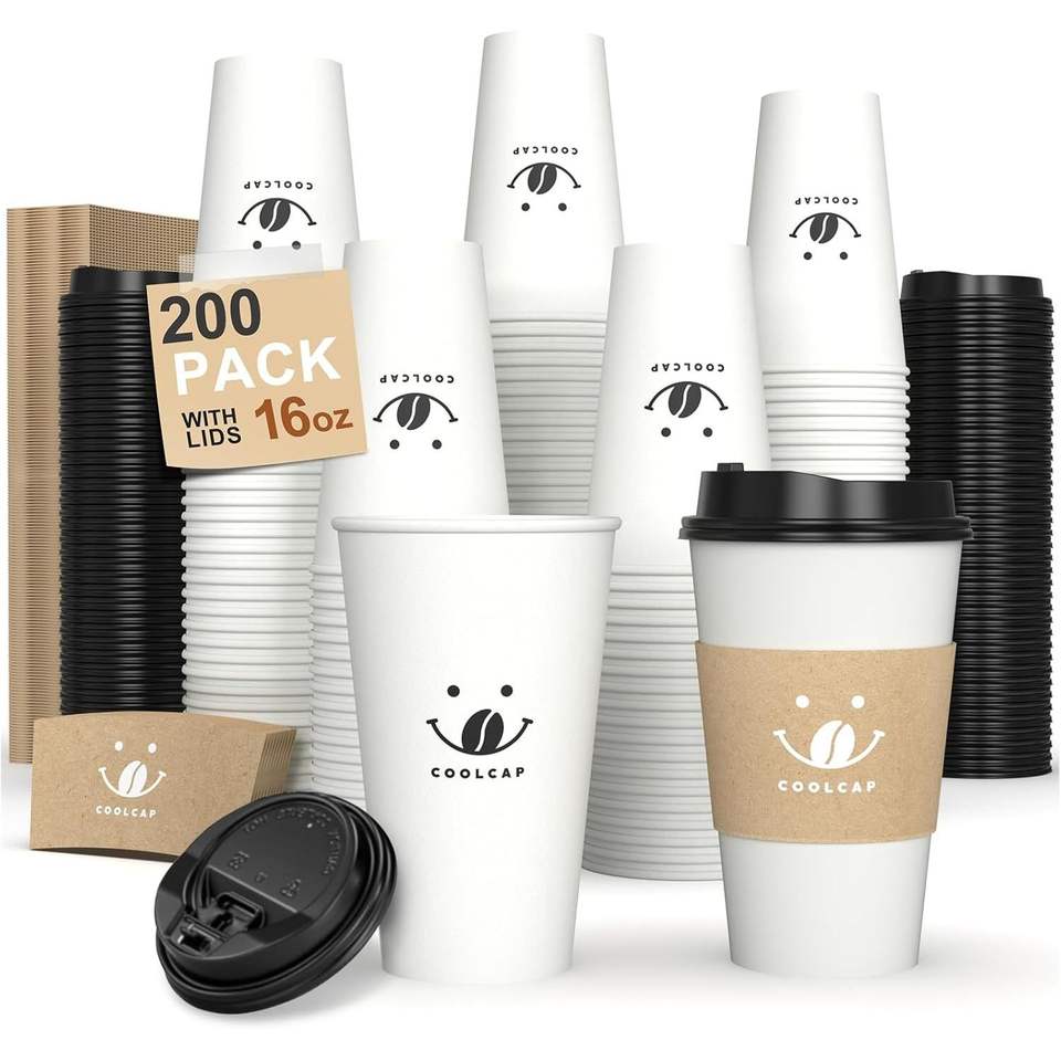แพ็ค 200 ใบ แก้วกาแฟกระดาษแบบใช้แล้วทิ้งขนาด 16 ออนซ์ พร้อมฝาปิด สำหรับเครื่องดื่มร้อนและเย็น พร้อมปลอกหุ้มแก้วแบบพกพา สีขาว