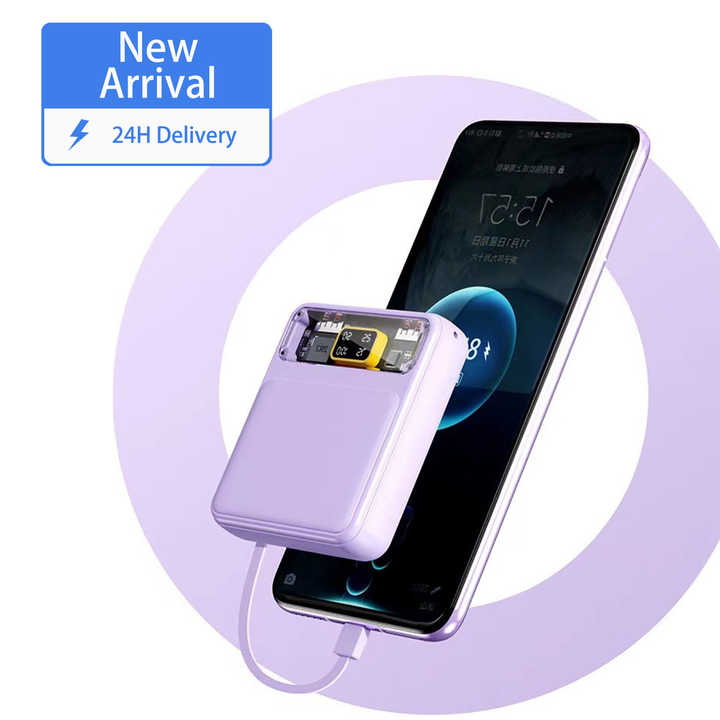 แบตเตอรี่สำรองแบบสายใส 20000mAh พร้อมสายชาร์จ ดีไซน์ไซเบอร์พังก์ แสดงสถานะแบตเตอรี่ ใช้ได้กับโทรศัพท์และแท็บเล็ต