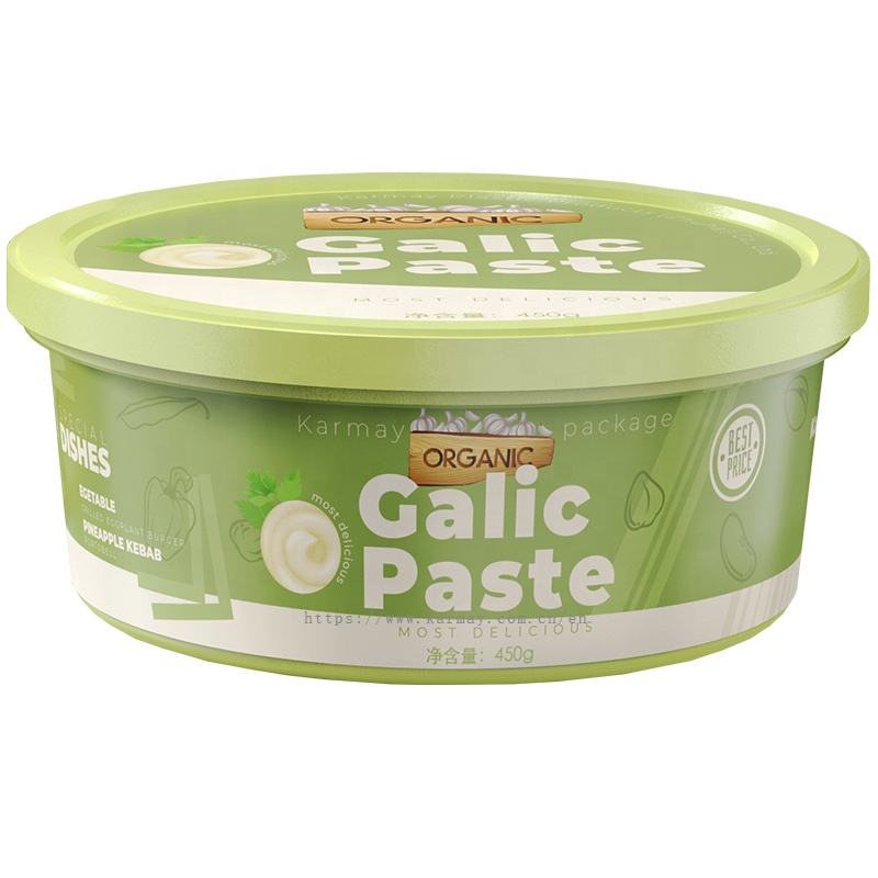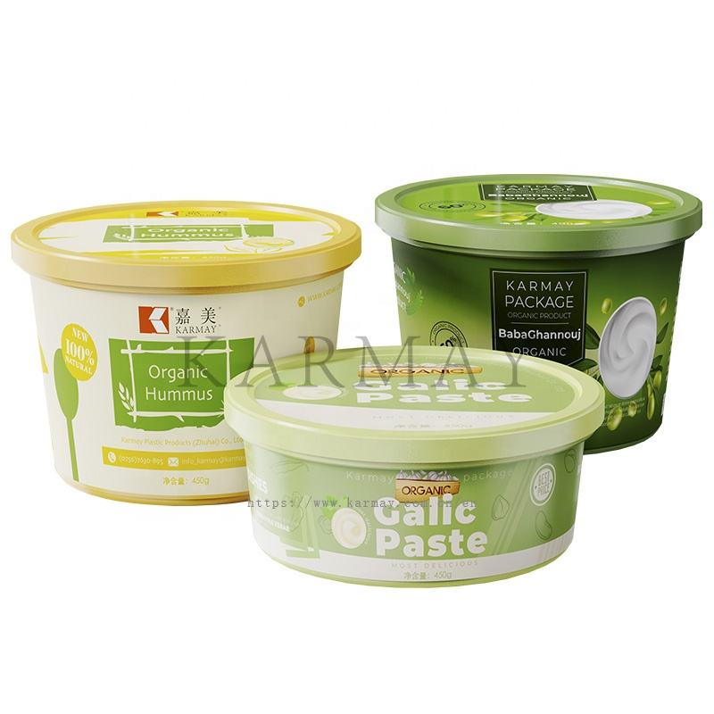 กระปุกพลาสติกทรงกลมขนาด 200 กรัม 250 มล. พร้อมฝาปิด สำหรับบรรจุภัณฑ์ฮัมมุส บาบาฮานูจ ซัมซูซัค แบบ IML