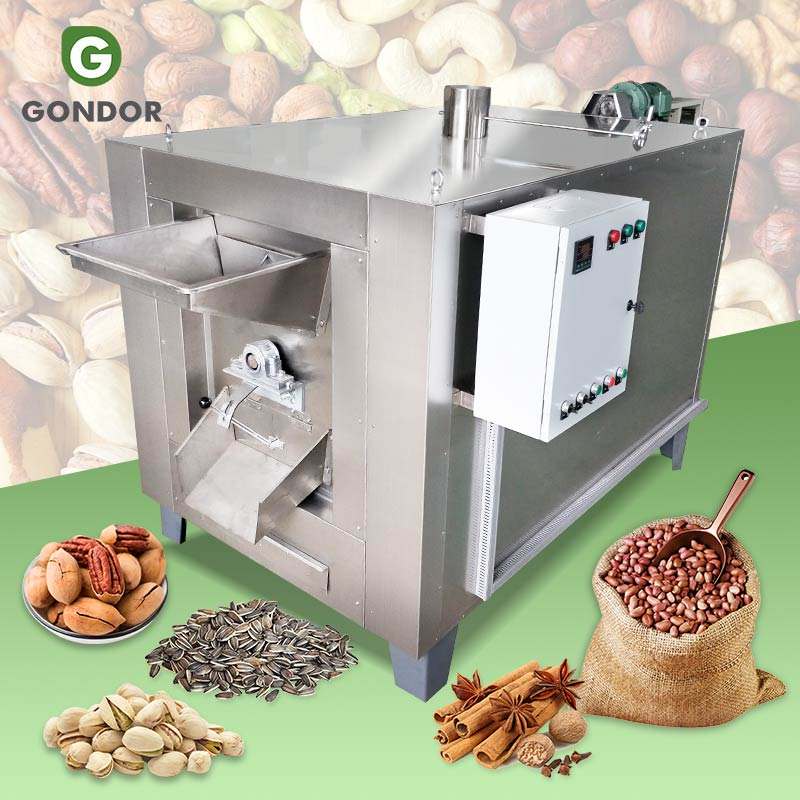 เครื่องคั่วเมล็ดโกโก้เชียขนาดเล็กแบบไฟฟ้าสำหรับอุตสาหกรรม 200 กก. เครื่องคั่วแบบหมุนสำหรับเมล็ดแมคคาเดเมียและถั่วลิสง