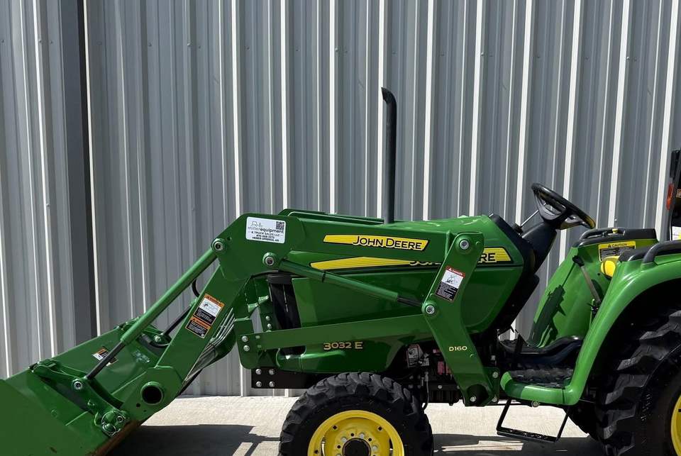 รถแทรกเตอร์จอห์น เดียร์ 3032E ปี 2015 พร้อมที่ตักด้านหน้าและถังติดตั้งเร็ว, รถแทรกเตอร์ขับเคลื่อน 4 ล้อ, เครื่องยนต์ดีเซล 32 แรงม้า, 540 PTO, ระบบติดตั้งแบบ 3 จุด