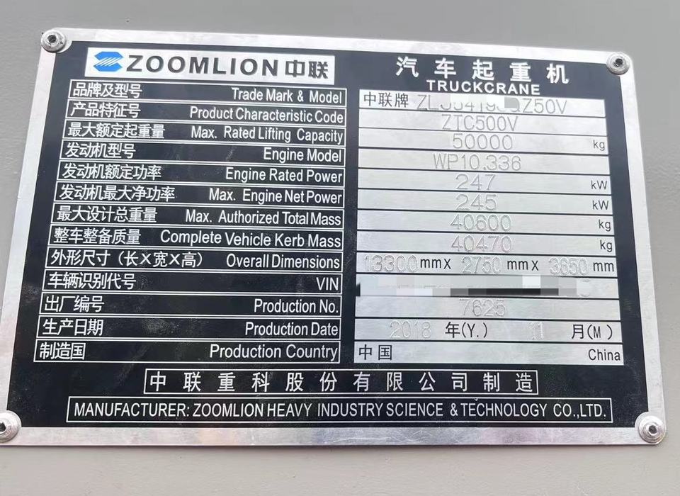รถเครน Zoomlion ZTC500V ปี 2017 มือสอง ความสูงยก 59.5 เมตร รับน้ำหนัก 50 ตัน พร้อมเครื่องยนต์และเกียร์ Weichai