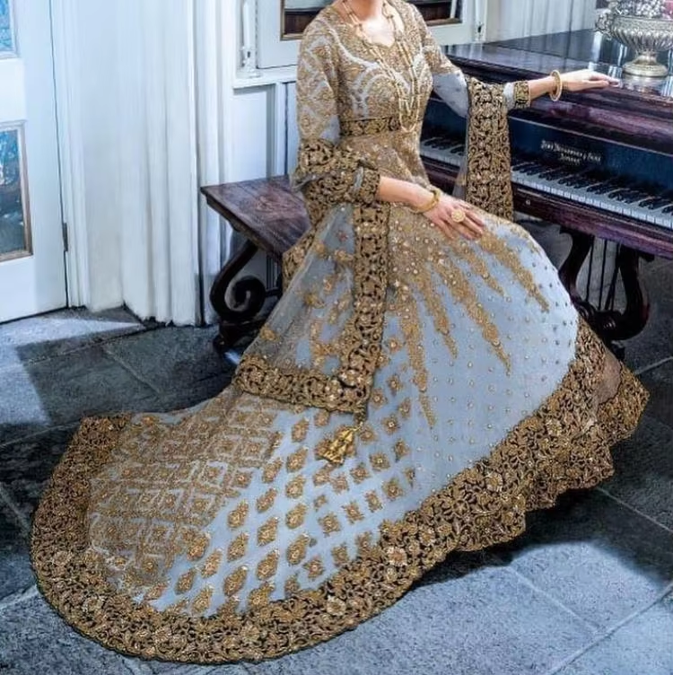 ชุดเดรสอานาร์กาลีแบบอินเดียและปากีสถานสุดหรู ปี 2019 พร้อมเลเฮนกาโจลี ปักลายซาร์โดซีอย่างประณีต สีฟ้าอ่อน สำหรับงานแต่งงาน