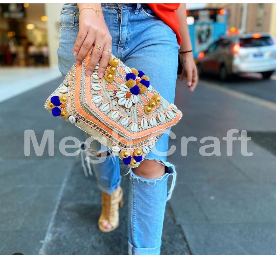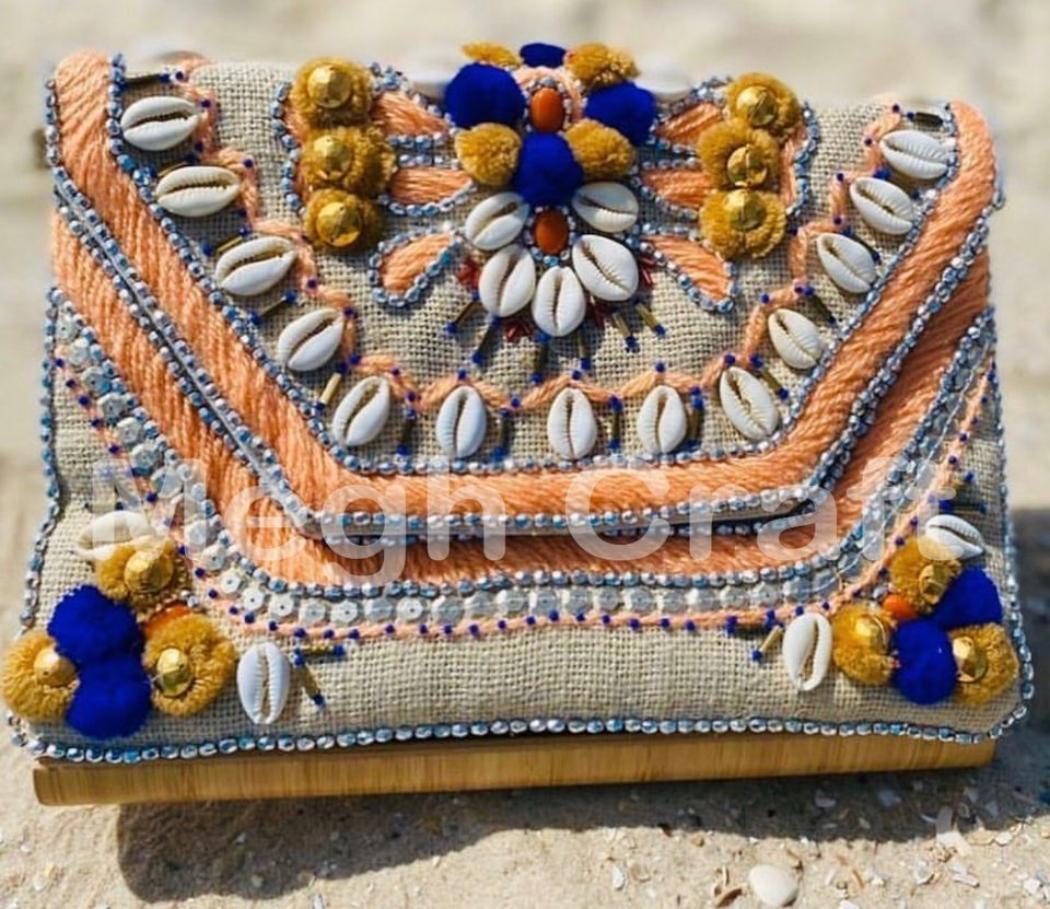 กระเป๋าคลัทช์สไตล์โบฮีเมียนปี 2020 ทำจากปอกระเจา ขายส่ง ประดับลูกปัด งานฝีมือแบบอินเดีย ลายเปลือกหอย พู่ห้อย ประดับหิน สำหรับงานกลางคืน