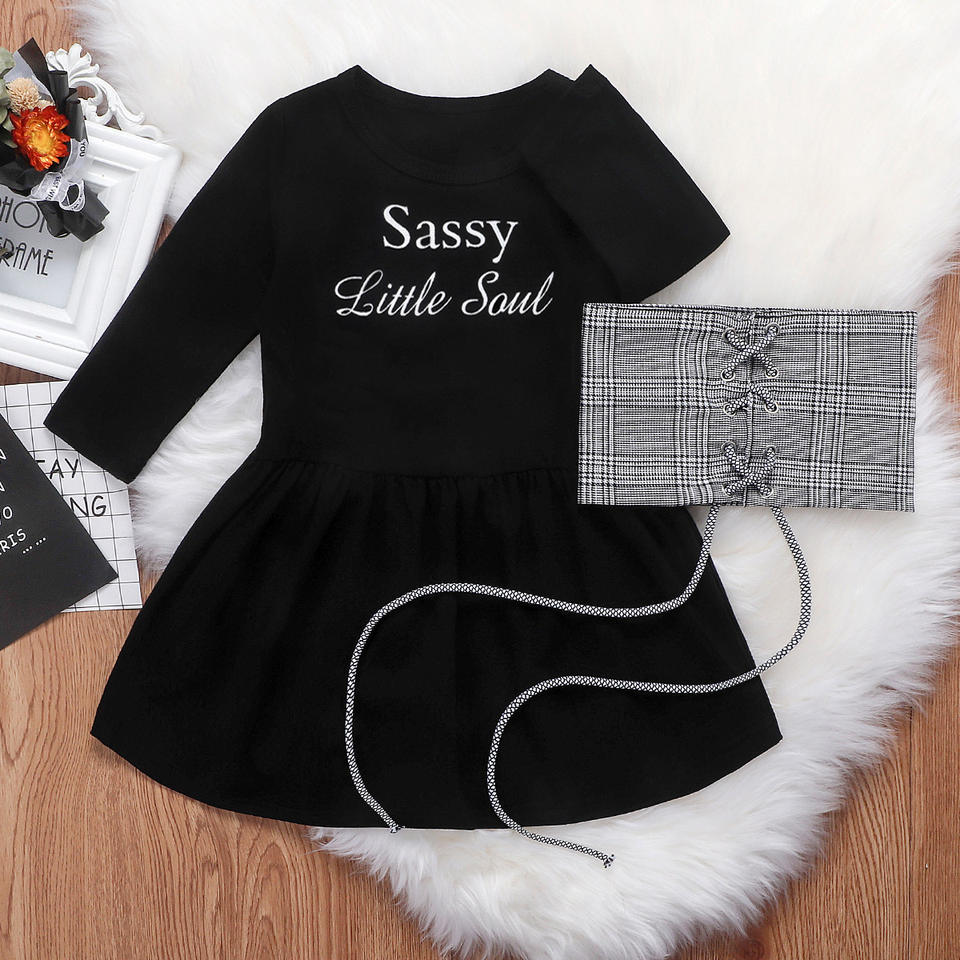 ชุดเดรสพิมพ์ลายตัวอักษรแฟชั่นใหม่ปี 2020 สำหรับเด็กผู้หญิง พร้อมเข็มขัดลายสก็อต ชุดเสื้อผ้าเด็กผู้หญิงแบบสองชิ้น
