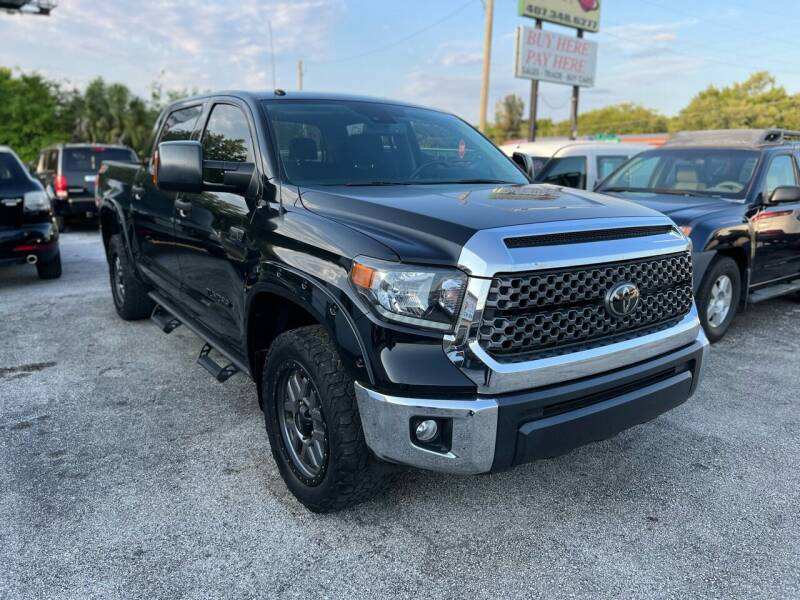 รถกระบะโตโยต้า ทันดรา ปี 2020 ขับเคลื่อนล้อหน้า รุ่น SR5 4 ประตู แบบ CrewMax 6 สูบ เทอร์โบ ระบบ FFV เบาะหนัง ภายในสีเข้ม พวงมาลัยซ้าย ล้อแม็ก R19