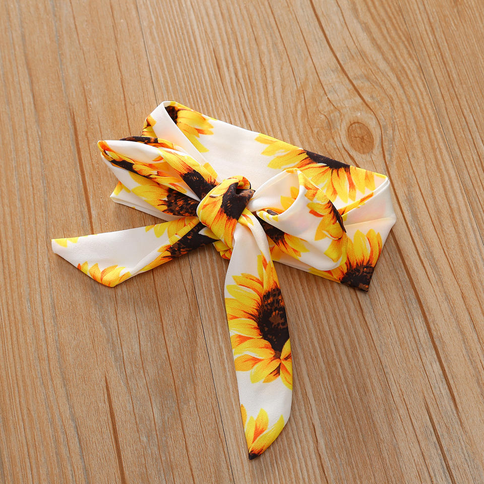 ชุดเด็กผู้หญิง 3 ชิ้น ปี 2021 เสื้อเปิดไหล่ลายดอกทานตะวัน กางเกงยีนส์ขาดๆ ผ้าคาดผม ชุดเด็กวัยหัดเดิน เสื้อผ้าเด็กฤดูร้อน
