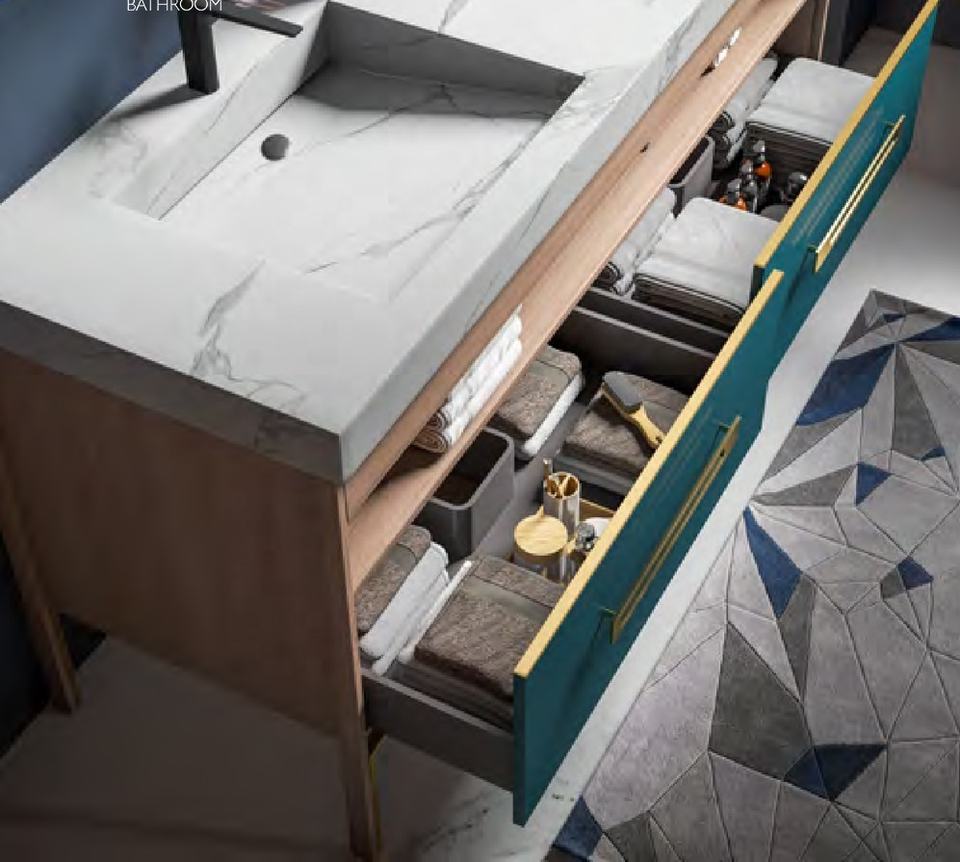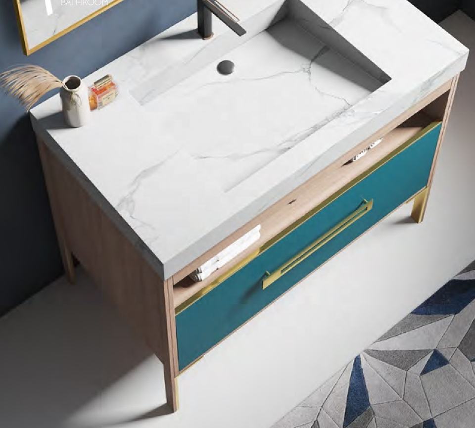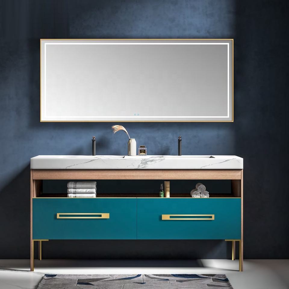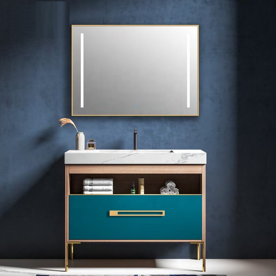 2021หรูหราห้องน้ำตู้ชั้นยืนไม้อัดโต๊ะเครื่องแป้งห้องน้ำที่มีแผ่นหินอ่างล้างหน้าหิน