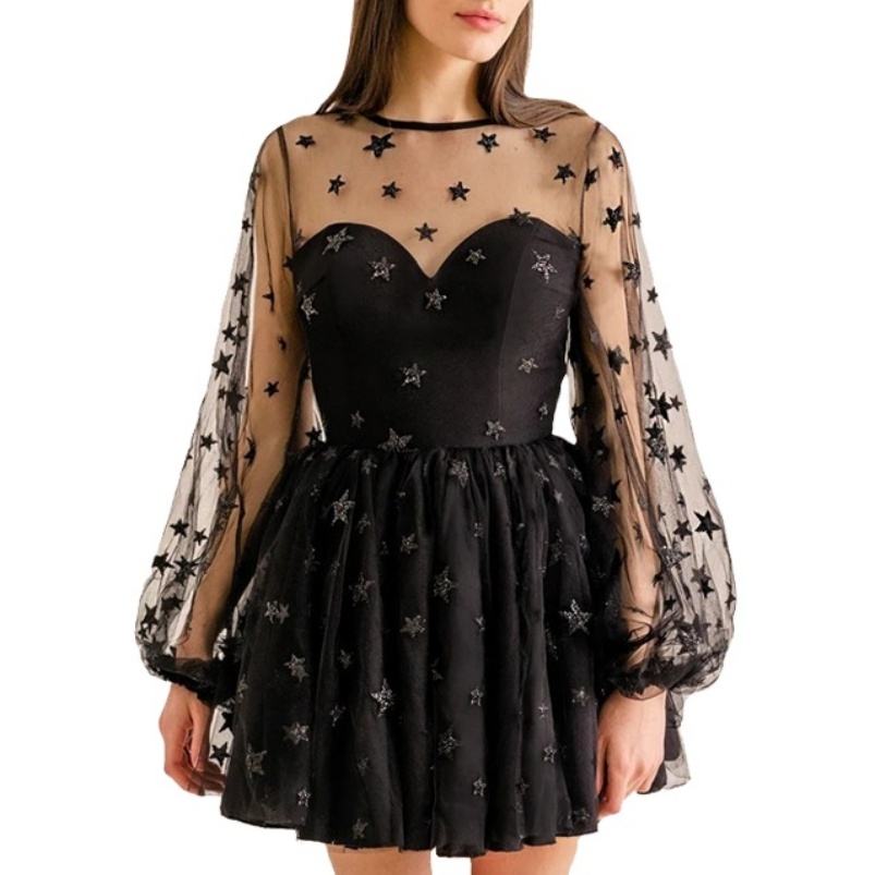 ชุดเดรสสำหรับไปคลับงานวันเกิดผ้าทูลรูปดาวสีดำแขนยาวพอง2021ยุโรปและอเมริกา