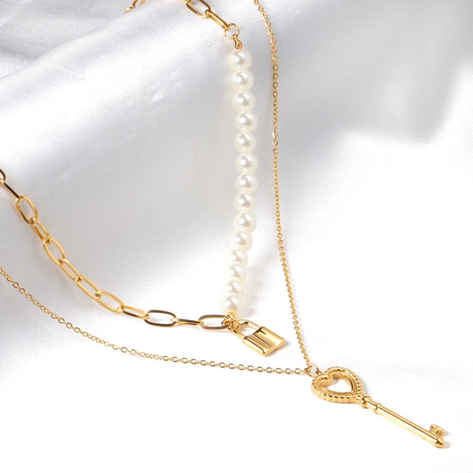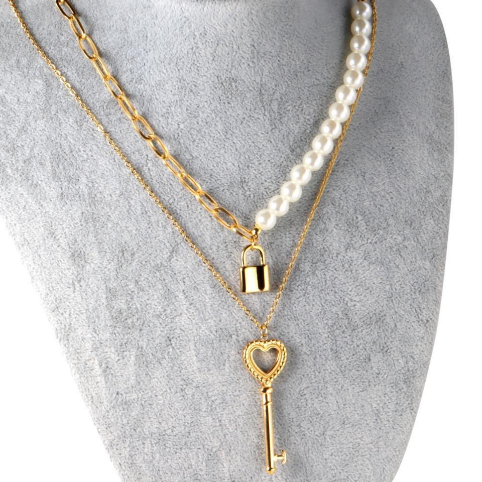 2021 Fashion Jewelry Stainless Steel Personalized Key and Lock Pendant Double Chains Necklace for Women