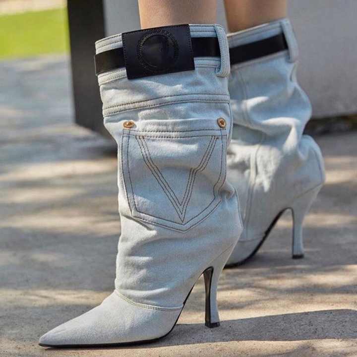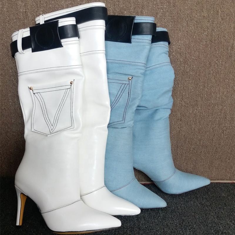 รองเท้าบูทแฟชั่นแบบใหม่ปี 2021 ทรงครึ่งเข่า ปลายแหลม ผ้าเดนิม พร้อมเข็มขัด สำหรับฤดูหนาว ไซส์ใหญ่พิเศษ 47
