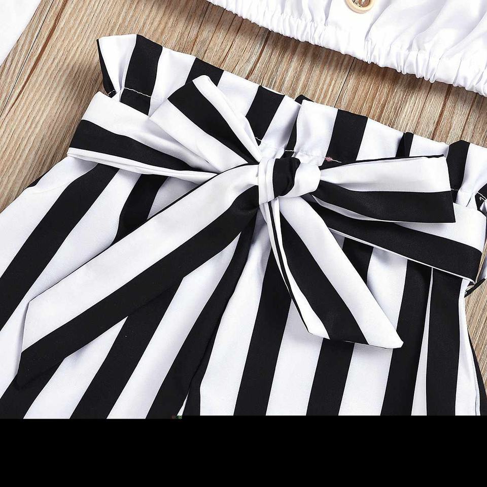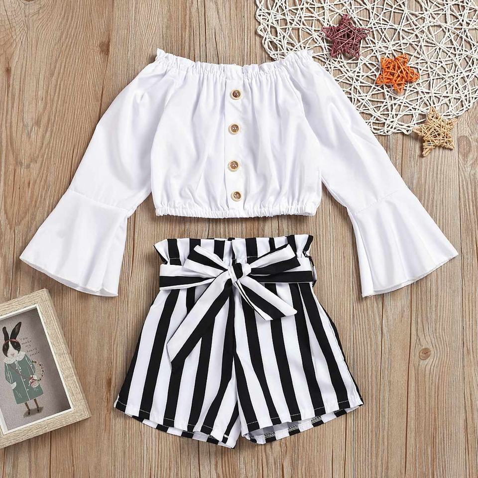 2021 เด็กวัยหัดเดินเด็กทารกเด็กหญิงรัฟเฟิลส์ ออฟ ชอลเดอร์เสื้อสีพื้น+ กางเกงขาสั้นลายชุด 2 ชิ้นชุดเสื้อผ้าเด็กทารกแรกเกิด