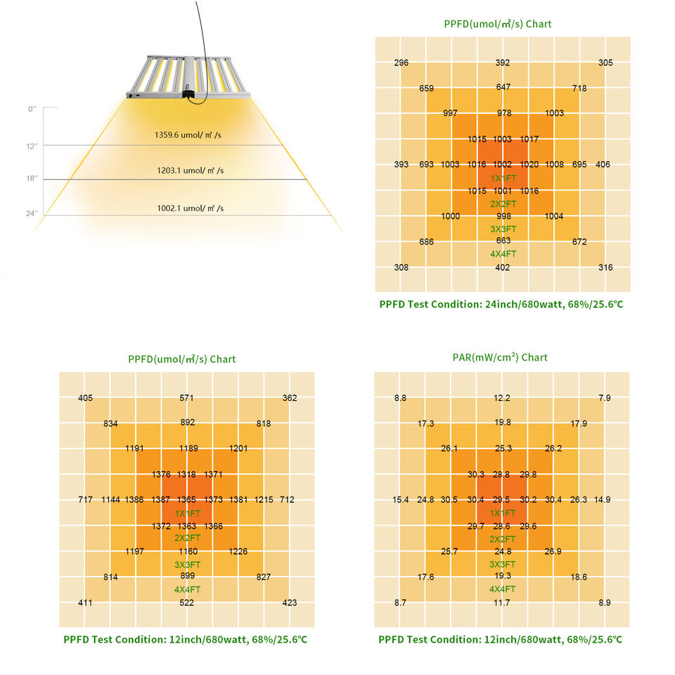 PPFDμmol/(m2 · เอส):1103.2umol/M2/S @ 668วัตต์24นิ้ว