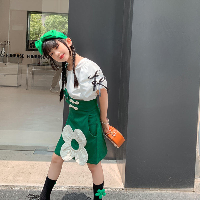 ชุดแฟชั่นลำลองฤดูร้อนสำหรับเด็กโตปี 2022 เสื้อแขนสั้นสีขาว + ชุดเดรสสายเดี่ยวสีเขียว ชุดเสื้อผ้า 2 ชิ้น สำหรับเด็กอายุ 5-10 ปี
