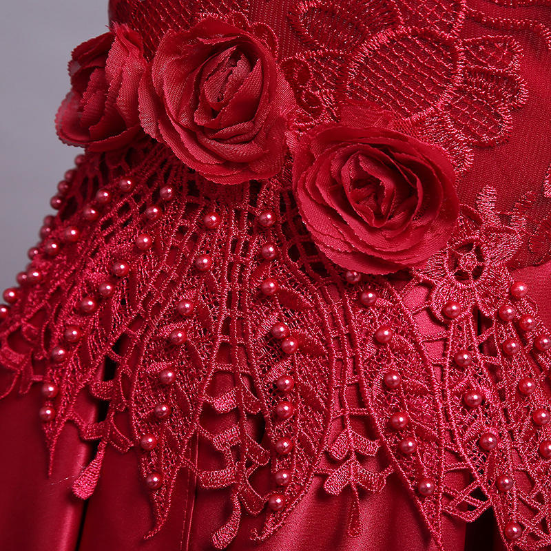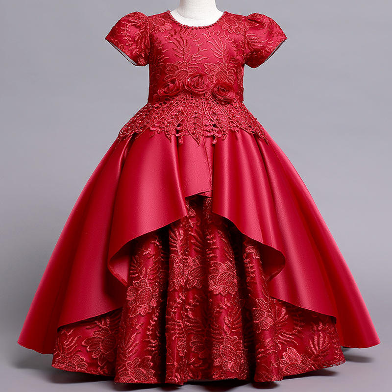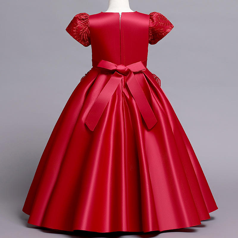 ชุดเดรสเด็กผู้หญิงปักลายดอกไม้ผ้าซาตินแขนสั้นสไตล์ยุโรปประจำปี 2022 ประดับโบว์