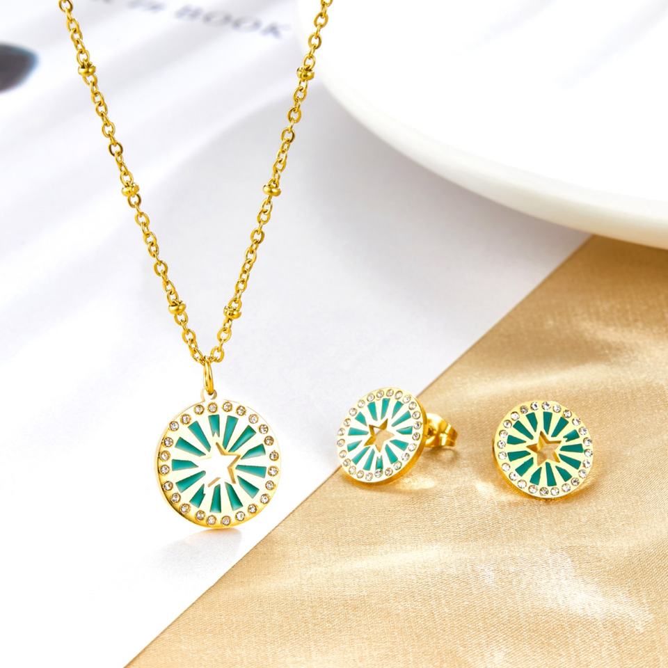 ขายตรงจากโรงงานปี 2022 ชุดเครื่องประดับสีเขียวประดับเพชรรูปดาวห้าแฉกสไตล์เลมอน ชุบทอง 18k ทำจากสแตนเลสกันน้ำ
