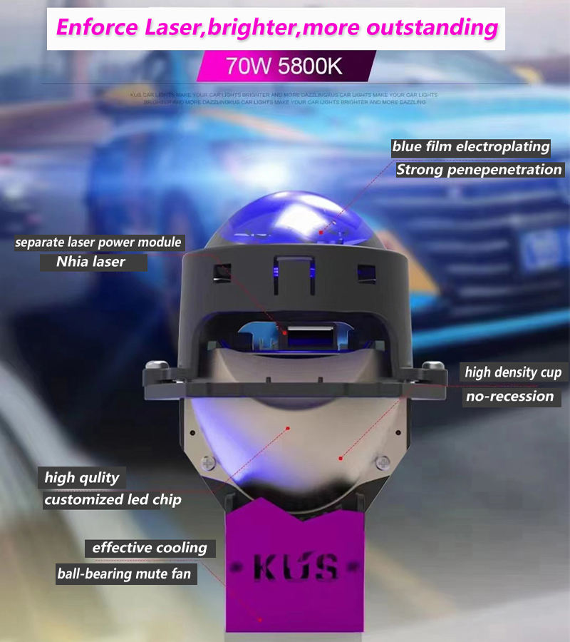 เลนส์โปรเจคเตอร์เลเซอร์ KUS ปี 2022 ความสว่าง 8000LM 6000K กันน้ำระดับ IP67 ใช้ไฟ 12V สำหรับรถยนต์รุ่น A3/A1/A4