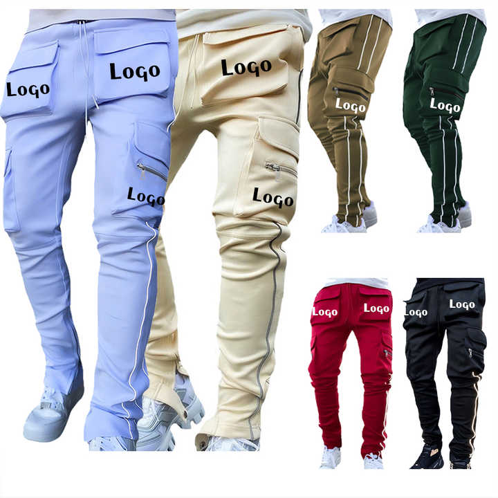2022กางเกงวอร์มคาร์โก้ผู้ชาย, กางเกงวิ่งแบบเรียงซ้อนกันน้ำหนักเบามีกระเป๋าด้านข้างสะท้อนแสงลายทางกระเป๋าทรงตรง