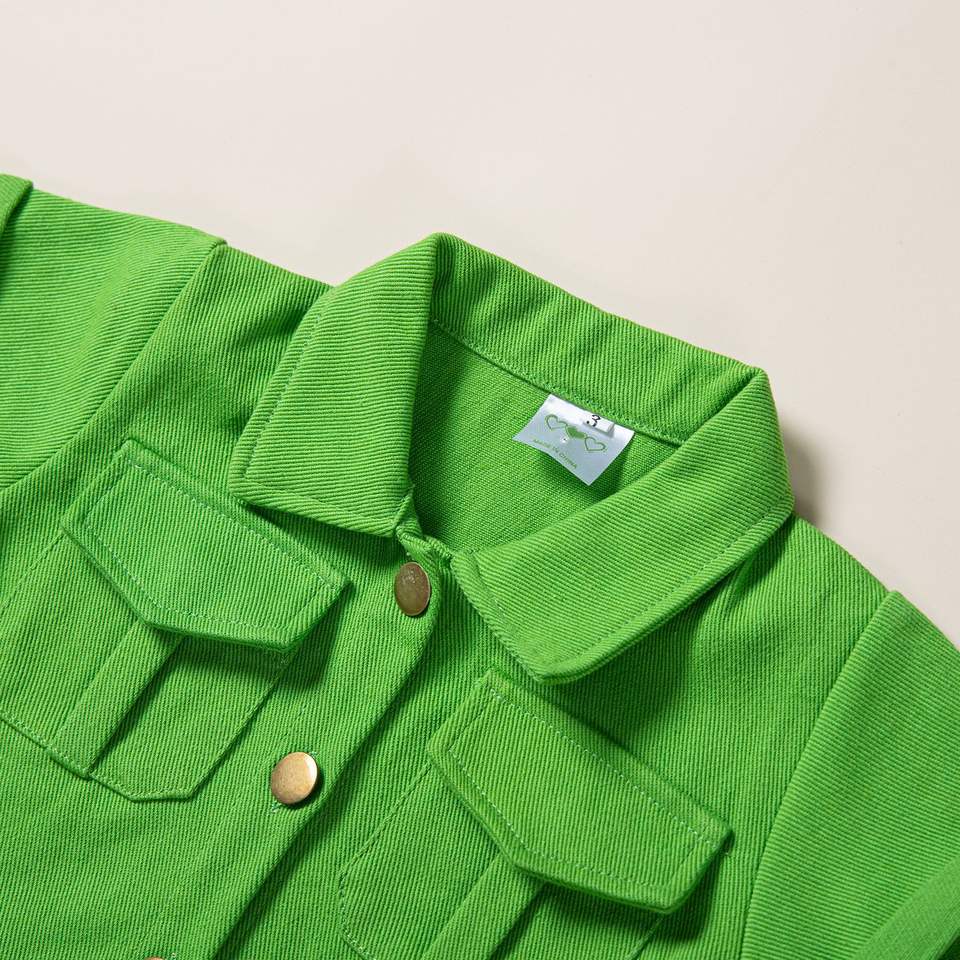 ชุดเซ็ตเสื้อผ้าเด็กผู้หญิงน่ารักปี 2022 แบบ 2 ชิ้น เสื้อครอปสีชมพูสดใสผ้าเดนิม + กางเกงขาสั้นสีเขียว คอปกเสื้อแบบพับได้