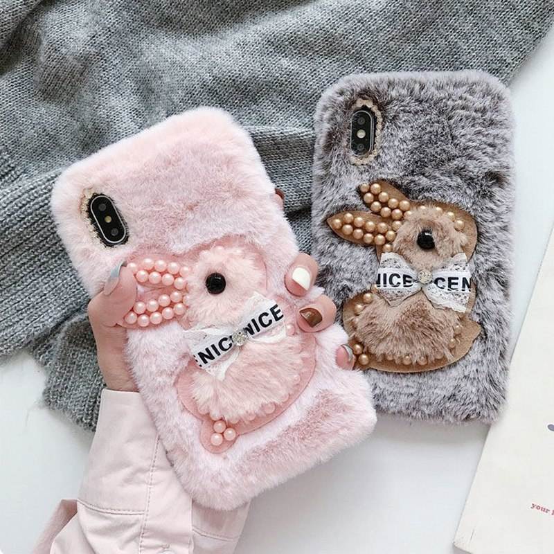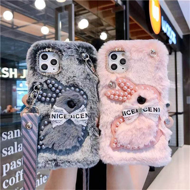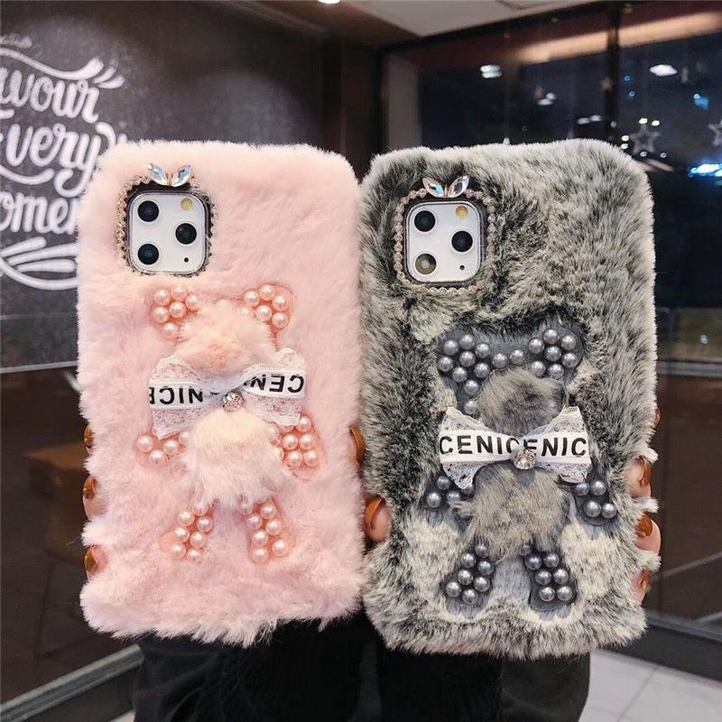 2022 New Plush Warm Soft Tpu Phone Case Diamond Pearl Rabbit Bear Rabbit Fur Phone case Tecno Pop 5 Pro for iPhone 12 13 Pro Max