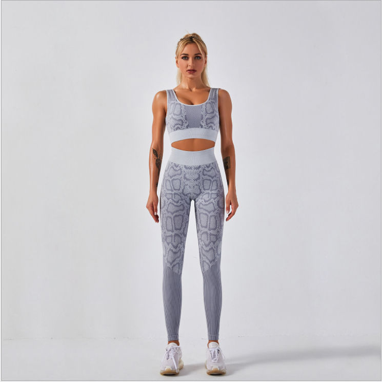 ชุดโยคะออกกำลังกายผ้าไนลอนไร้ตะเข็บพิมพ์ลายหนังงูสำหรับผู้หญิงชุดวอร์มเล่นกีฬาชุดเลกกิ้งบราพร้อมบริการ OEM