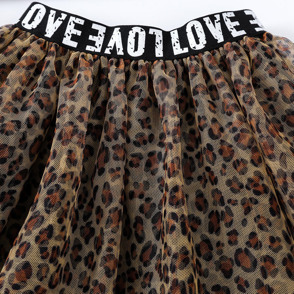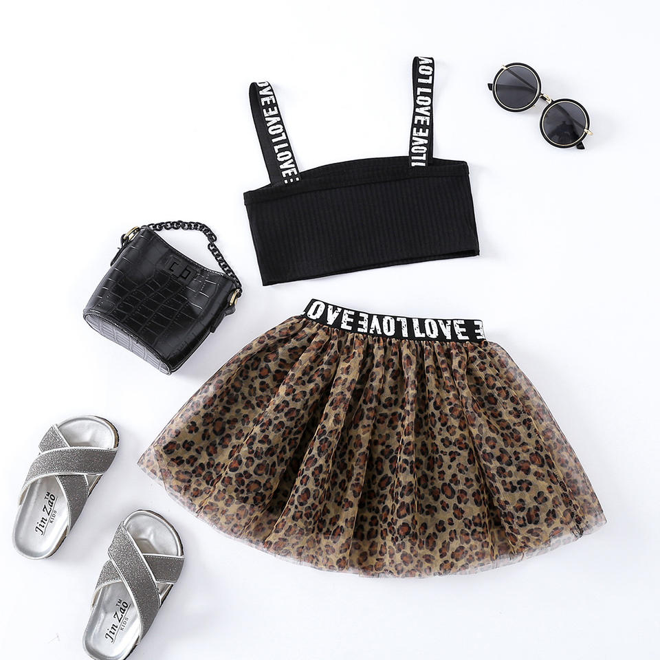ชุดเซ็ตฤดูร้อนปี 2022 สำหรับสาวๆ ลายเส้นพิมพ์ตัวอักษร สายเดี่ยวเสื้อครอปท็อป กระโปรงตาข่ายลายเสือดาว