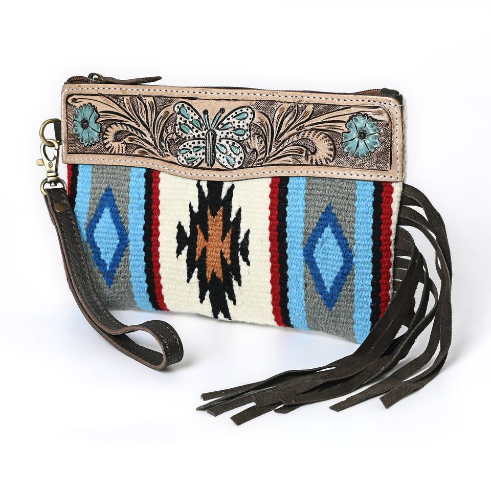 Design:wristlet with a hand tooled patch and cowhide