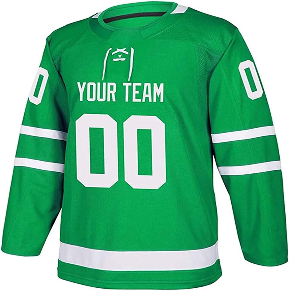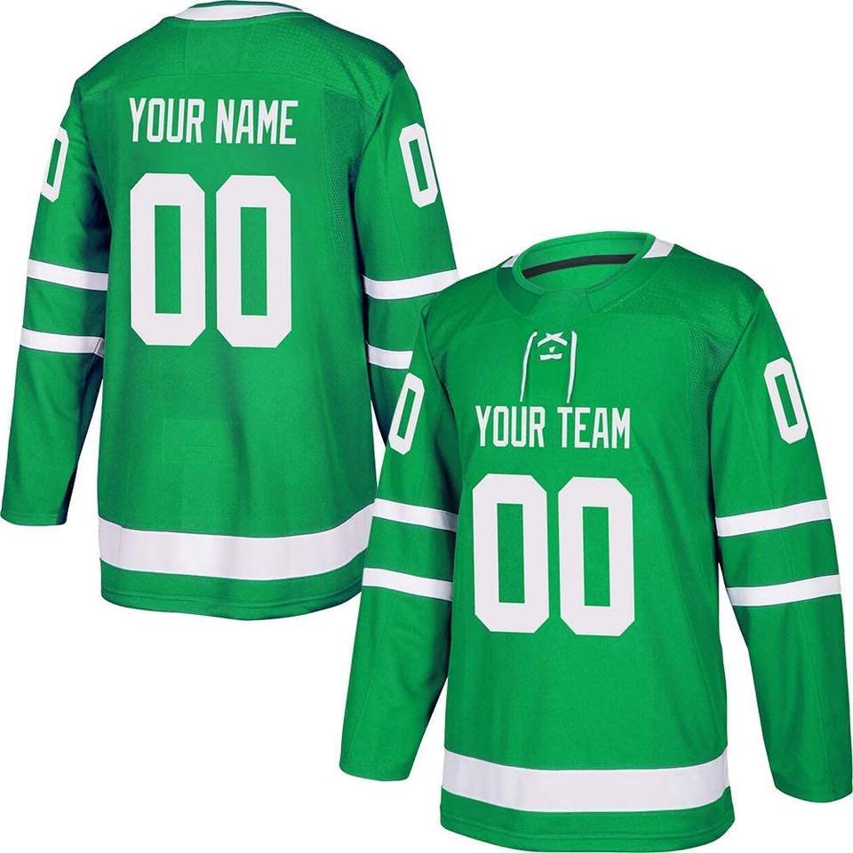 เสื้อเจอร์ซีย์ฮ็อกกี้น้ำแข็งสีเขียวพิมพ์ชื่อทีมและหมายเลข S-5XL สำหรับผู้ชายผู้หญิงเครื่องแบบ2023