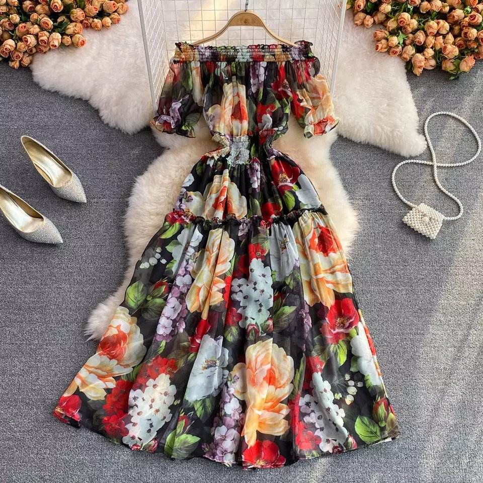 เดรสชีฟองผู้หญิงทรงเอไลน์พิมพ์ลาย คอเฉียงเปิดไหล่ เอวสูง รุ่นฮอลิเดย์บีช บิ๊กสวิง ปี 2023
