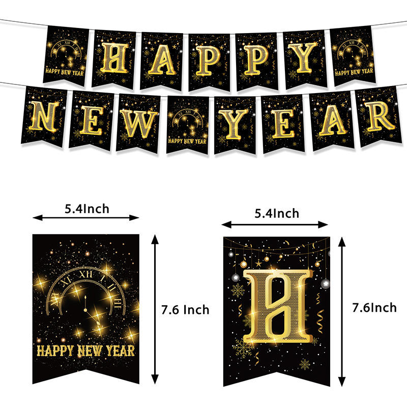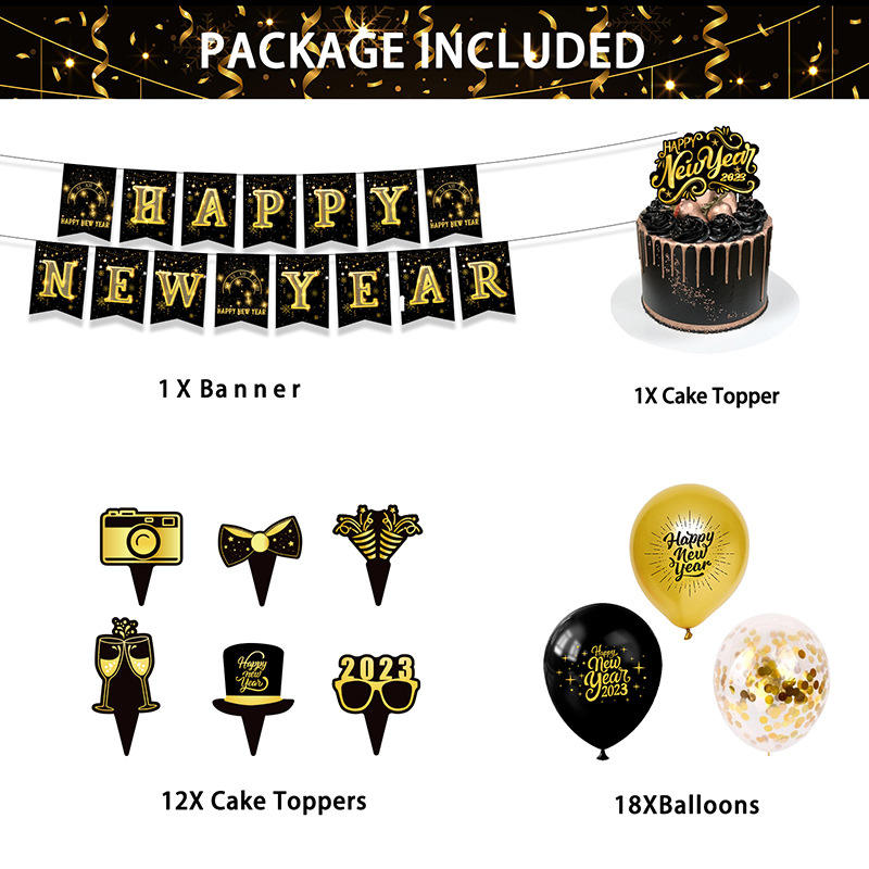2023ปีใหม่สีดำและสีทองบรรยากาศงานปาร์ตี้ปีใหม่ตกแต่งธงแบบดึงใส่เค้กลูกโป่งยางสำหรับใส่การ์ดปีใหม่