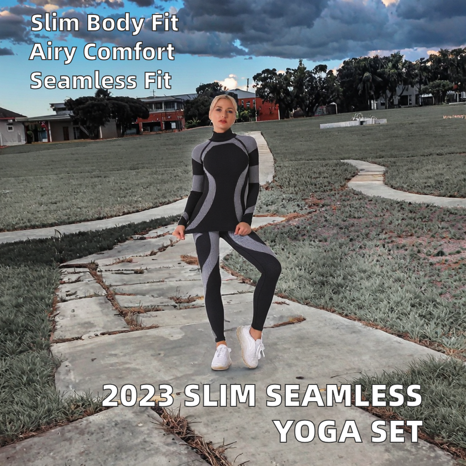 ชุดออกกำลังกายโยคะแบบสลิมฟิต ปี 2023 ชุดกีฬาผ้าถักไร้รอยต่อ ลายทาง แขนยาว สองชิ้น ชุดฟิตเนส ลายพิมพ์