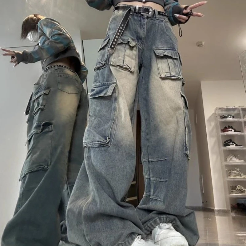 กางเกงคาร์โก้ผู้หญิงขายาวแบบหลายกระเป๋า, กางเกงยีนส์เอวสูงซักได้สไตล์ Y2K 2023ฤดูร้อน