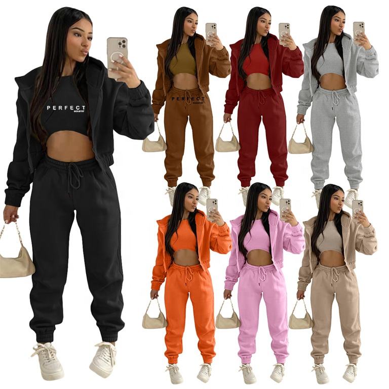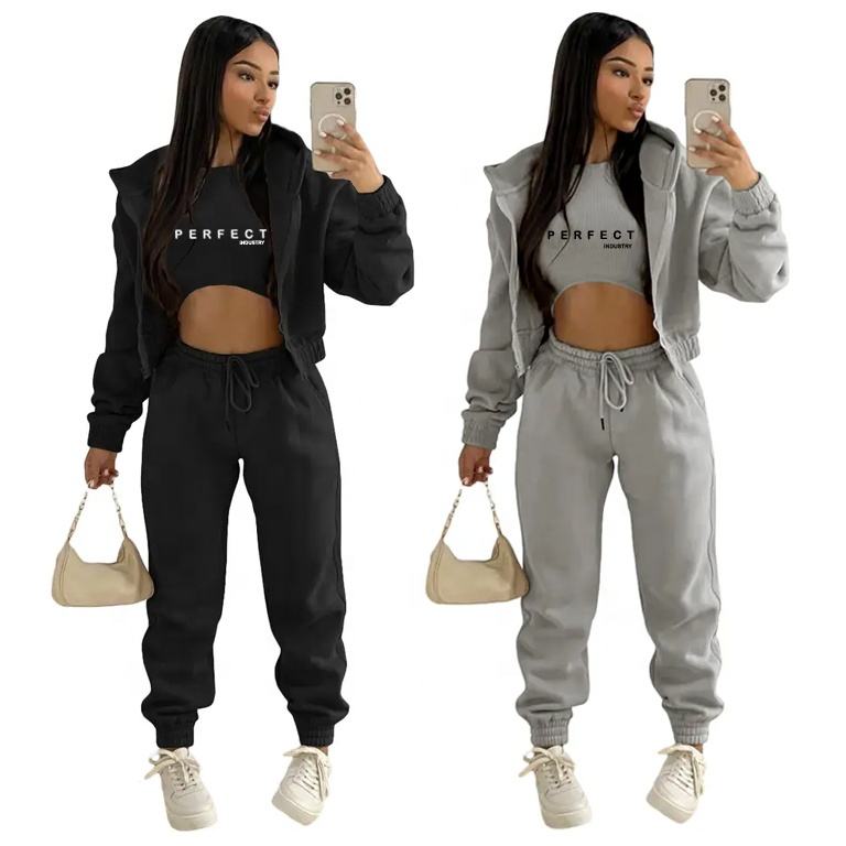 ชุดเสื้อผ้าผู้หญิง 3 ชิ้น เสื้อครอปมีซิป เสื้อกล้าม และกางเกงจ็อกเกอร์ ชุดเซ็ตผ้าฝ้ายฟลีซคุณภาพสูง เสื้อฮู้ดมีซิป ชุดวอร์ม