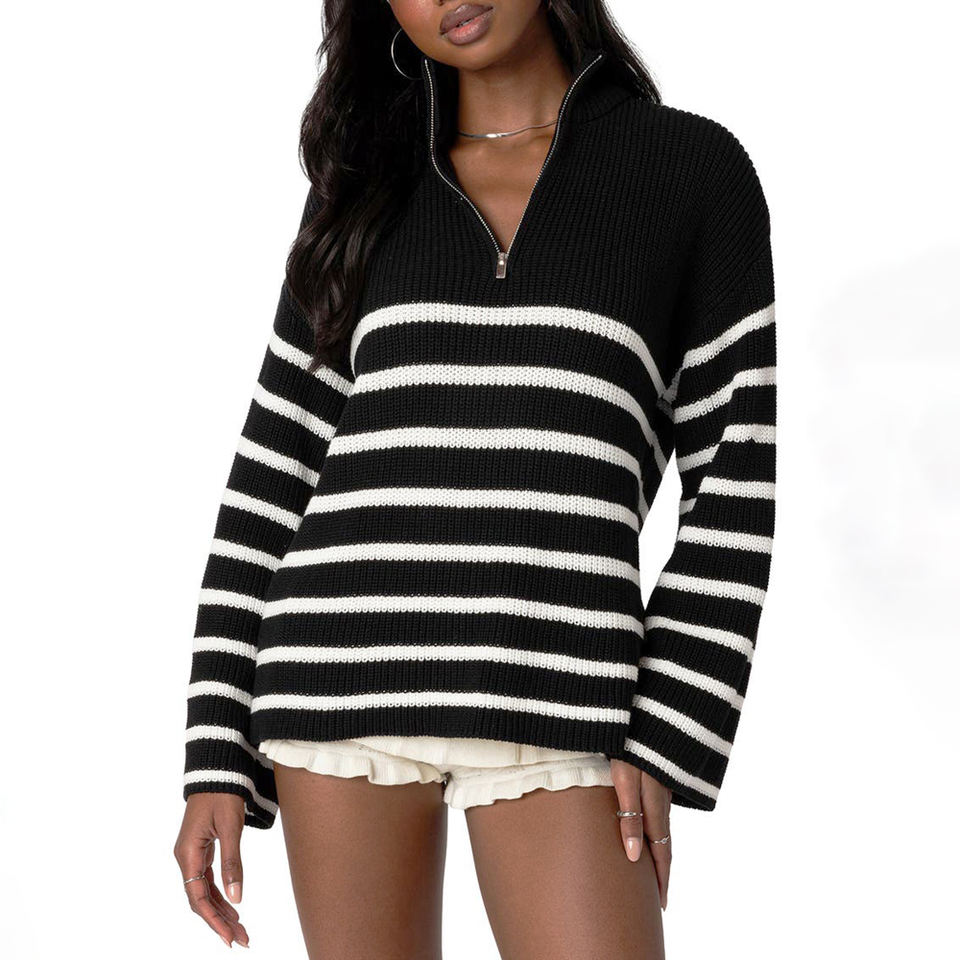 เสื้อสเวตเตอร์คอกลมลายทางสีน้ำเงินและสีขาวเสื้อถักน้ำหนักเบาแนวชมรมสำหรับงานกิจกรรมและสไตล์กรีก