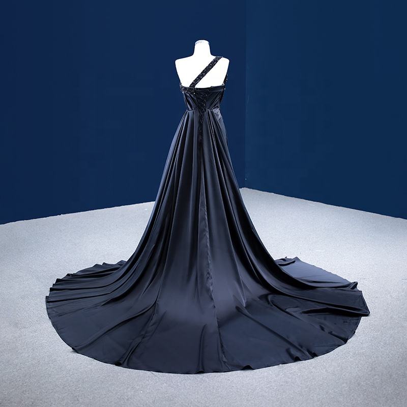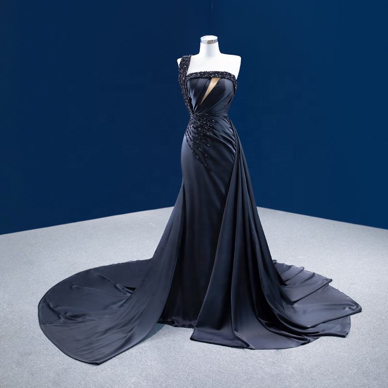 2023ผู้หญิงนางเงือกสีดำซาตินลูกปัดจีบขายส่งชุดราตรีกับ Overskirt