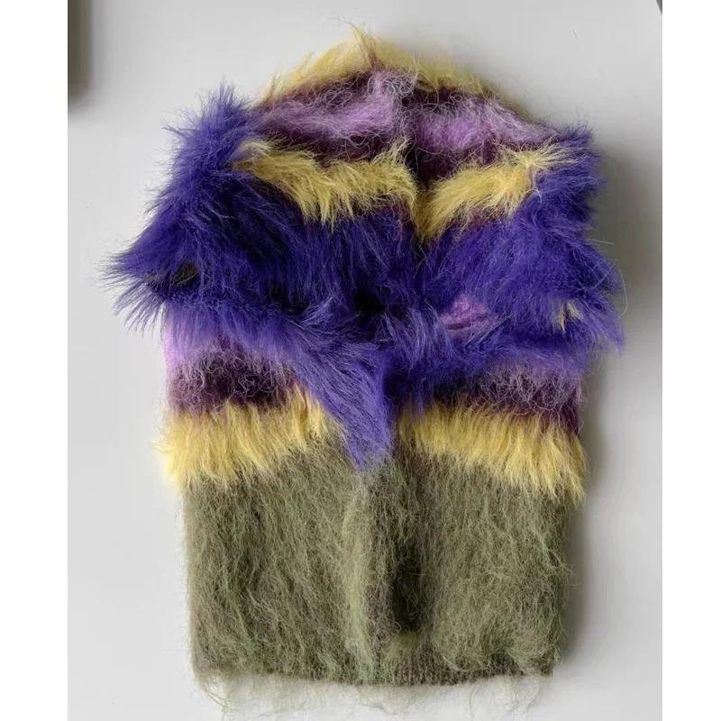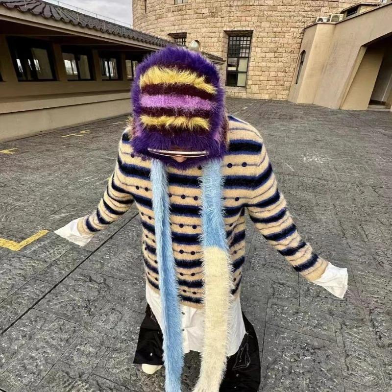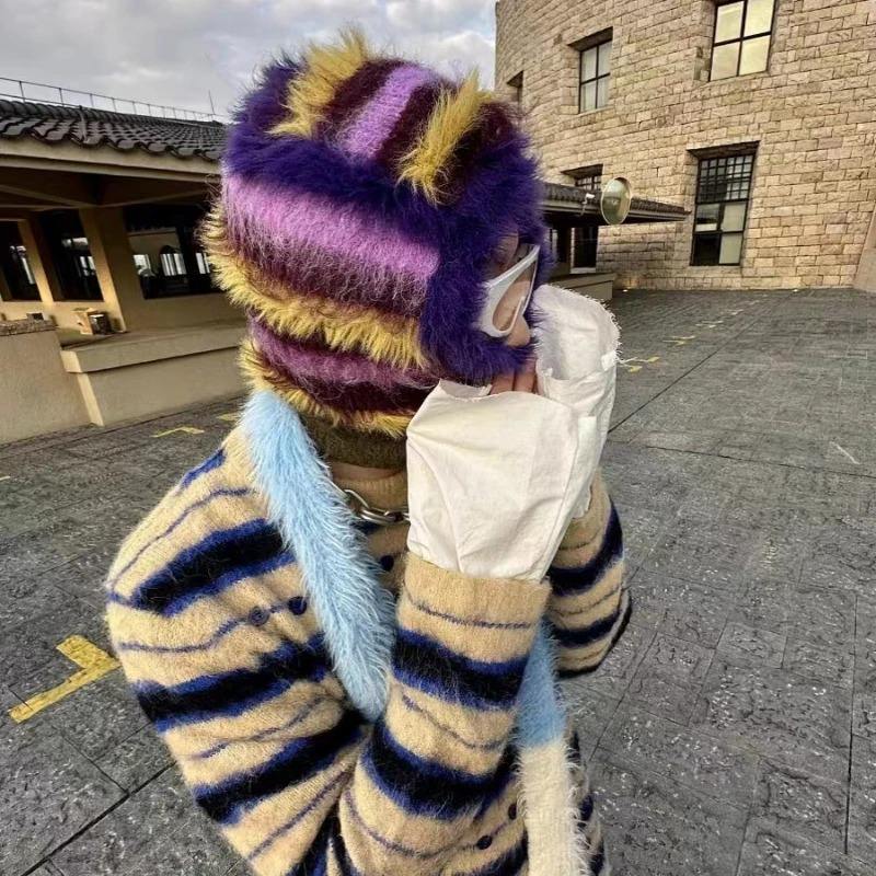 2023ขนสัตว์ผสมตุ๊กตาBalaclava ContrastสีFluffyถักผู้หญิงฤดูหนาวคอProtector One Beaniesขายส่ง